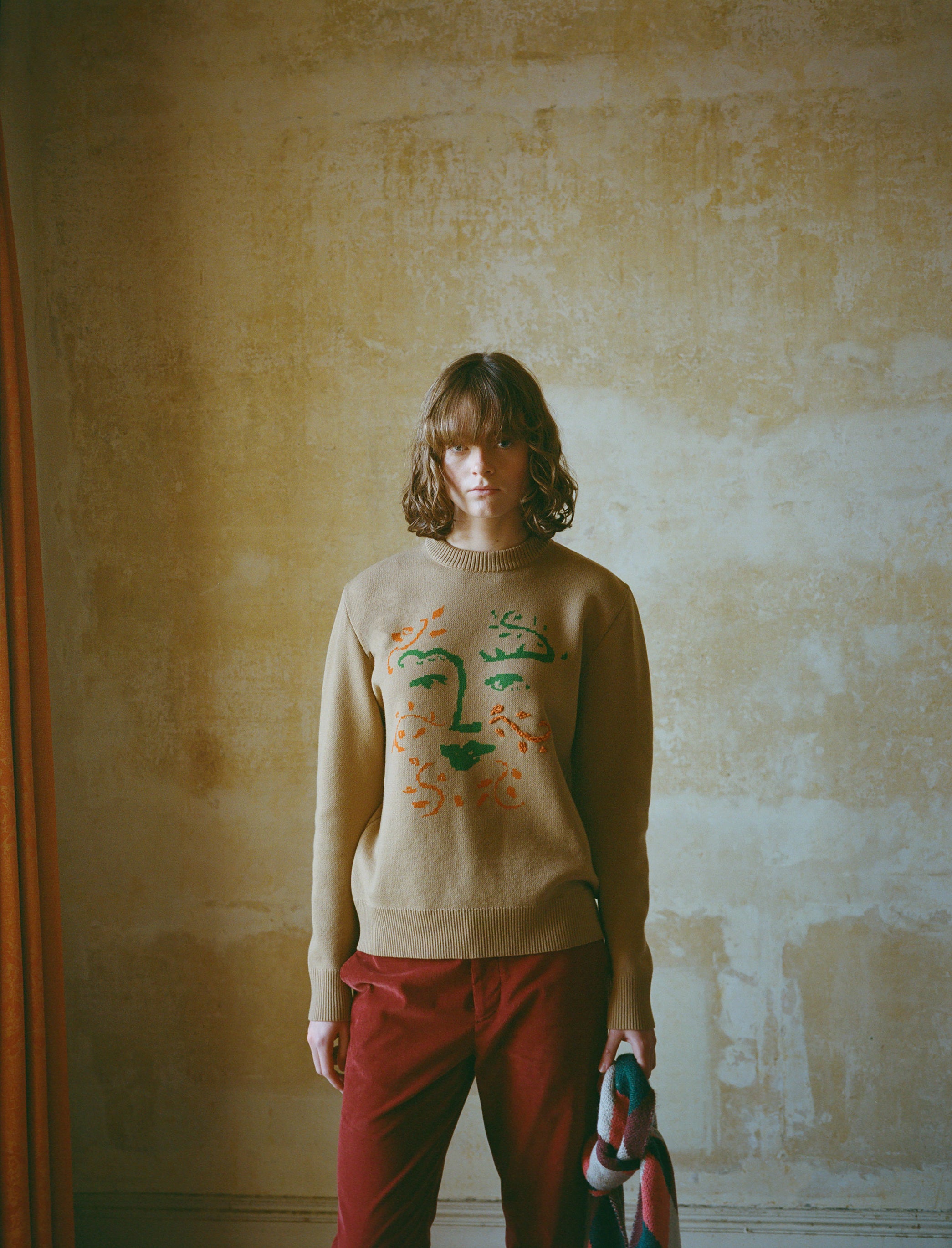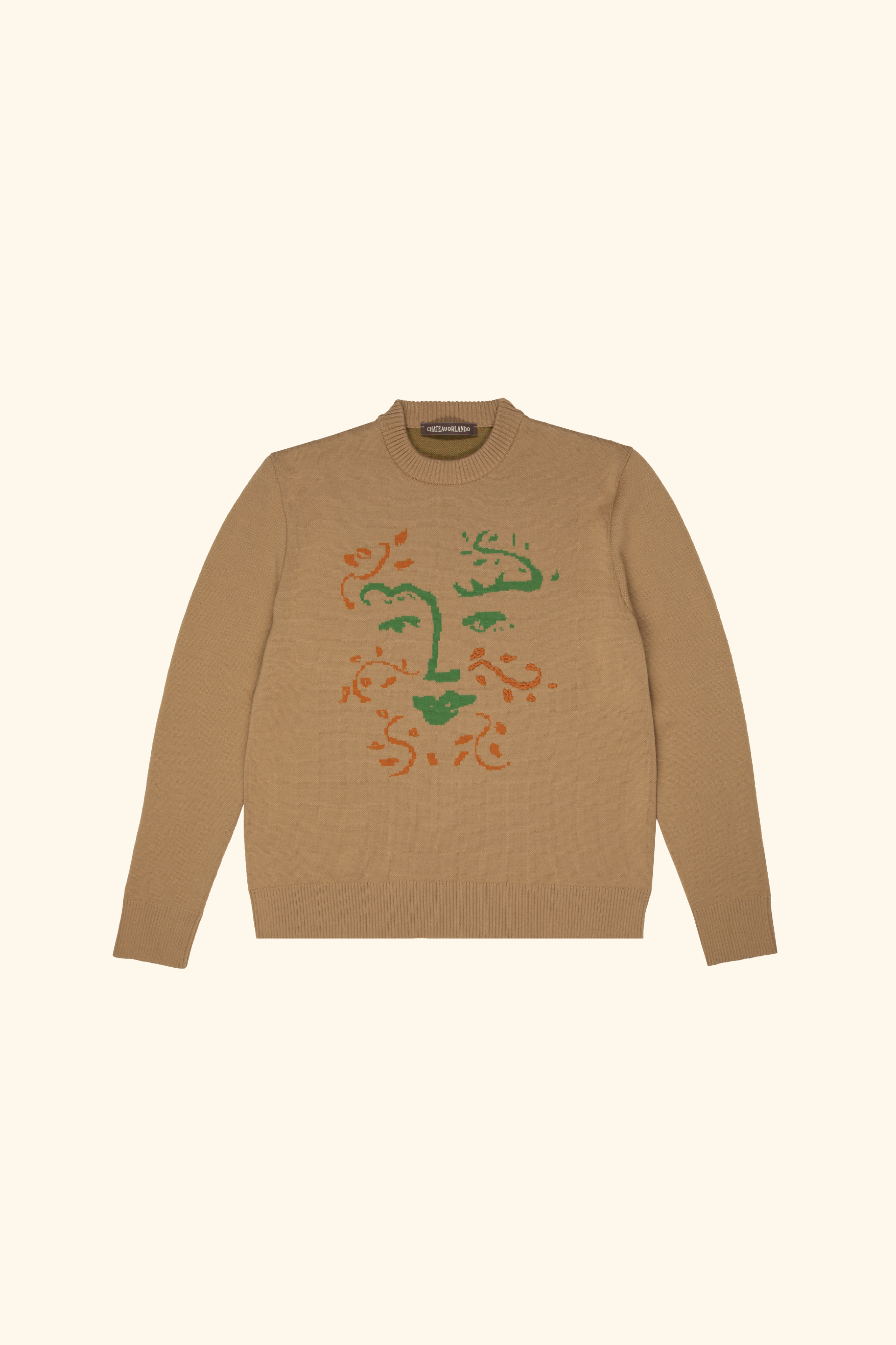 Merino wool jacquard crewneck jumper including hand embroidered details, with design inspired by the Green Man, keeper of the forests and woods and emblem of the birth-death-rebirth cycle of the natural year