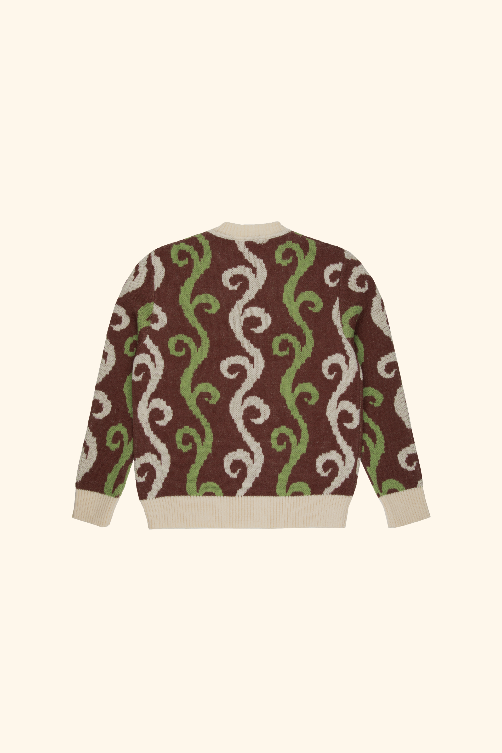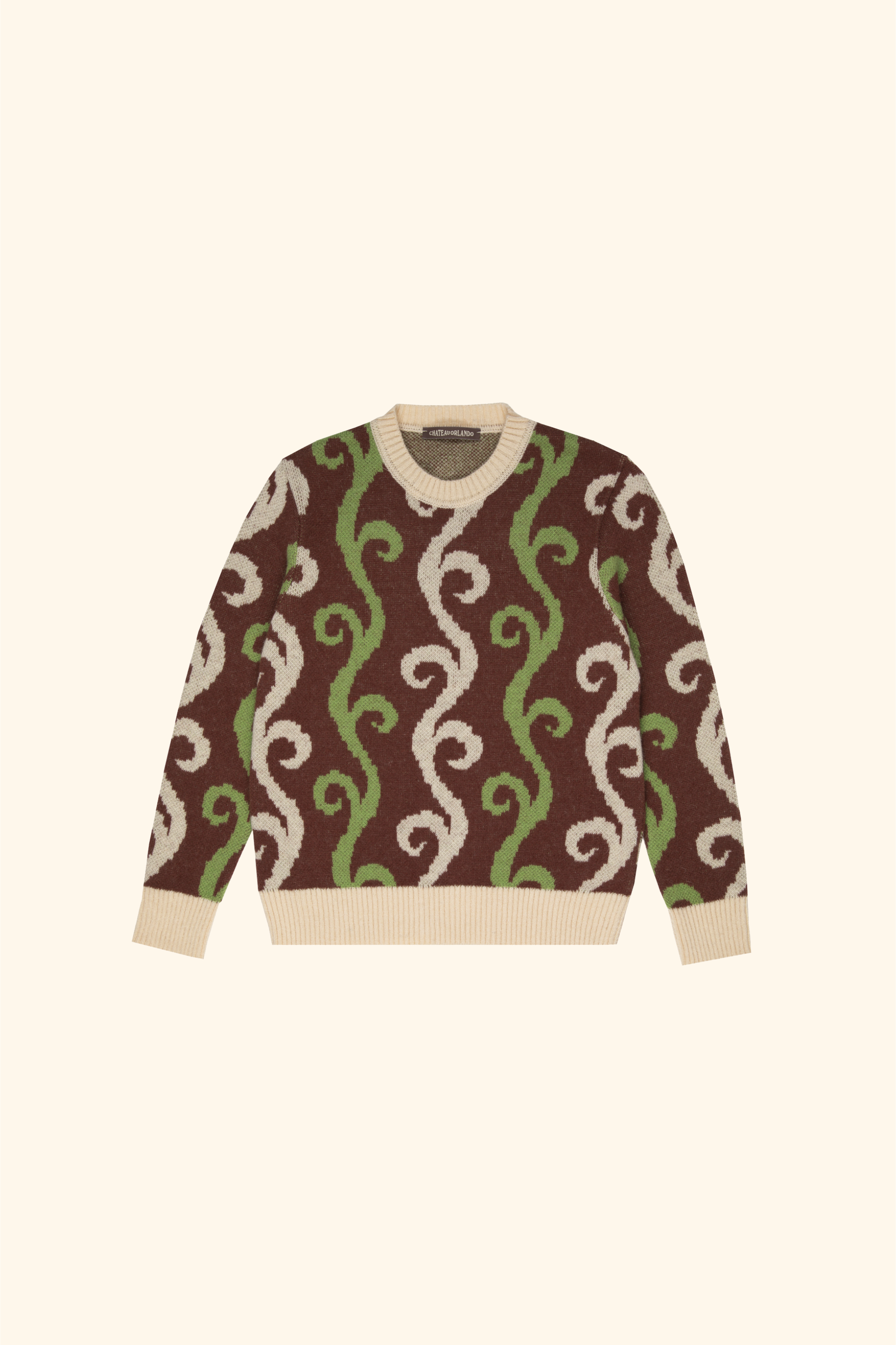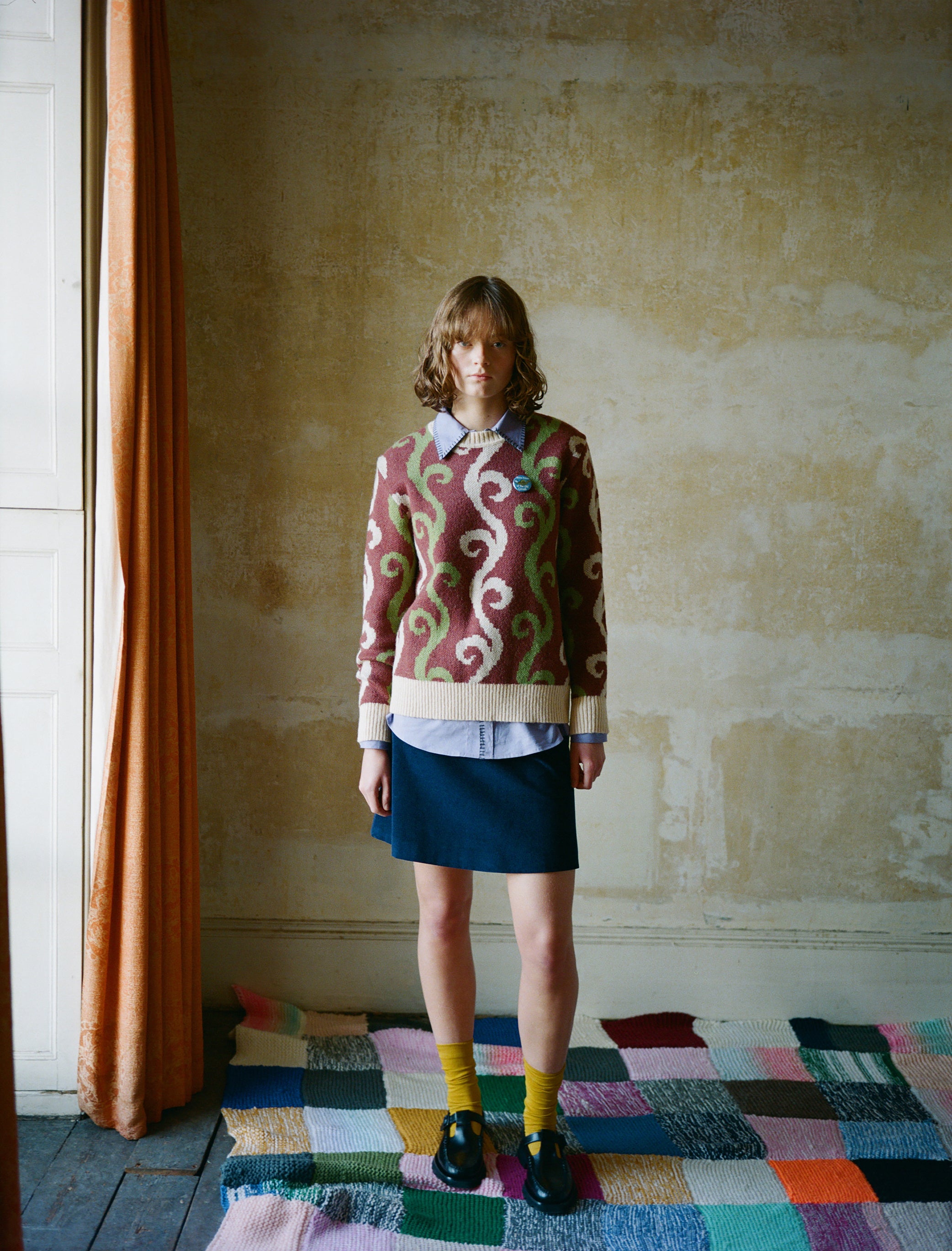 Mohair wool jacquard crewneck jumper with design inspired by tapestry church kneelers