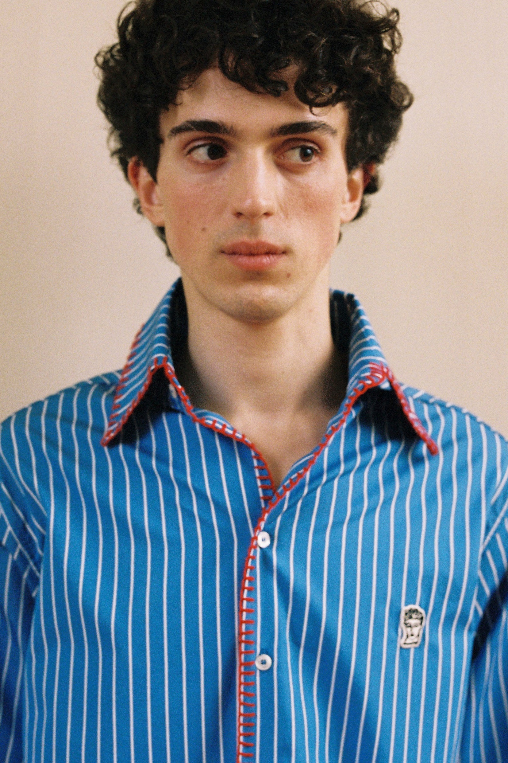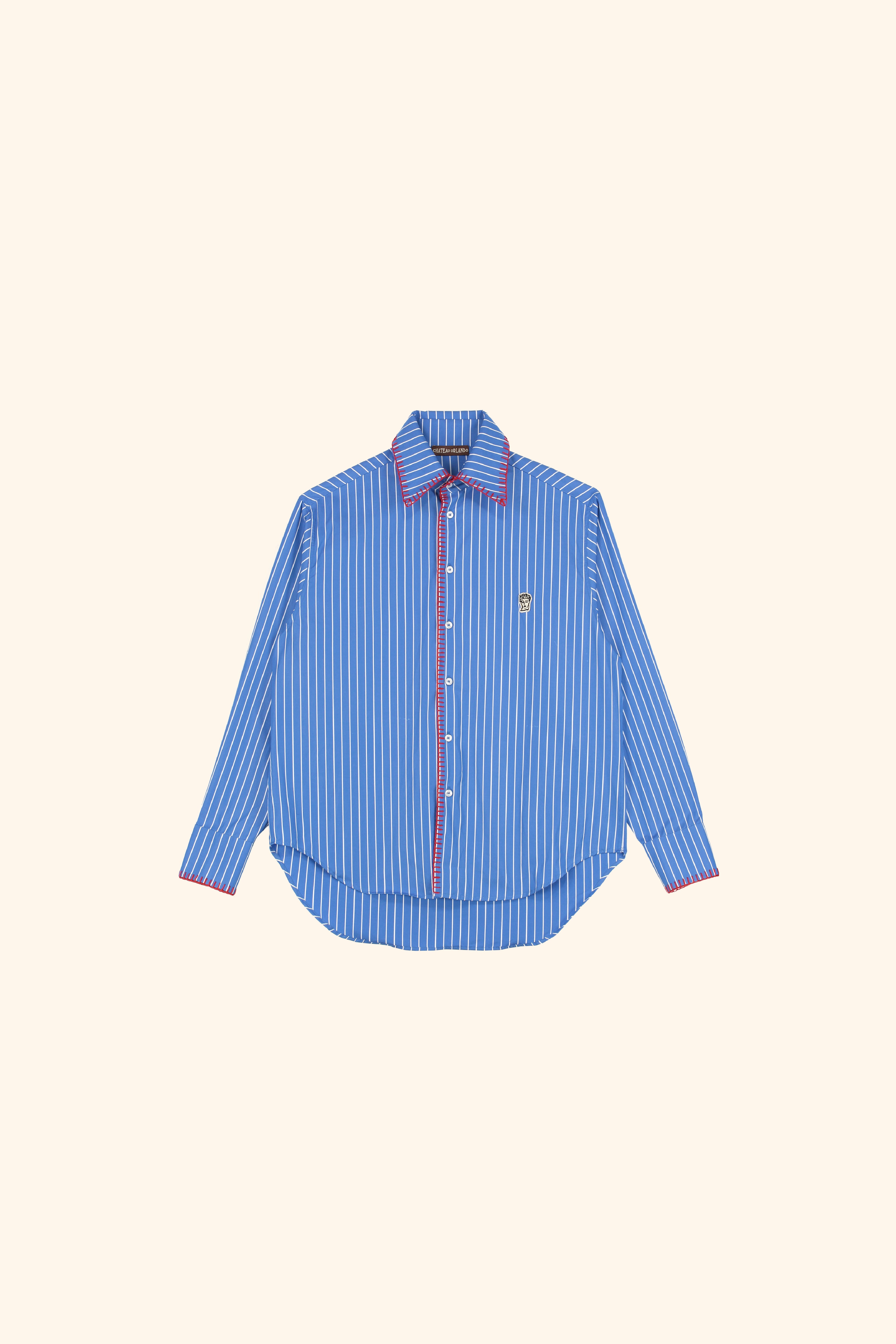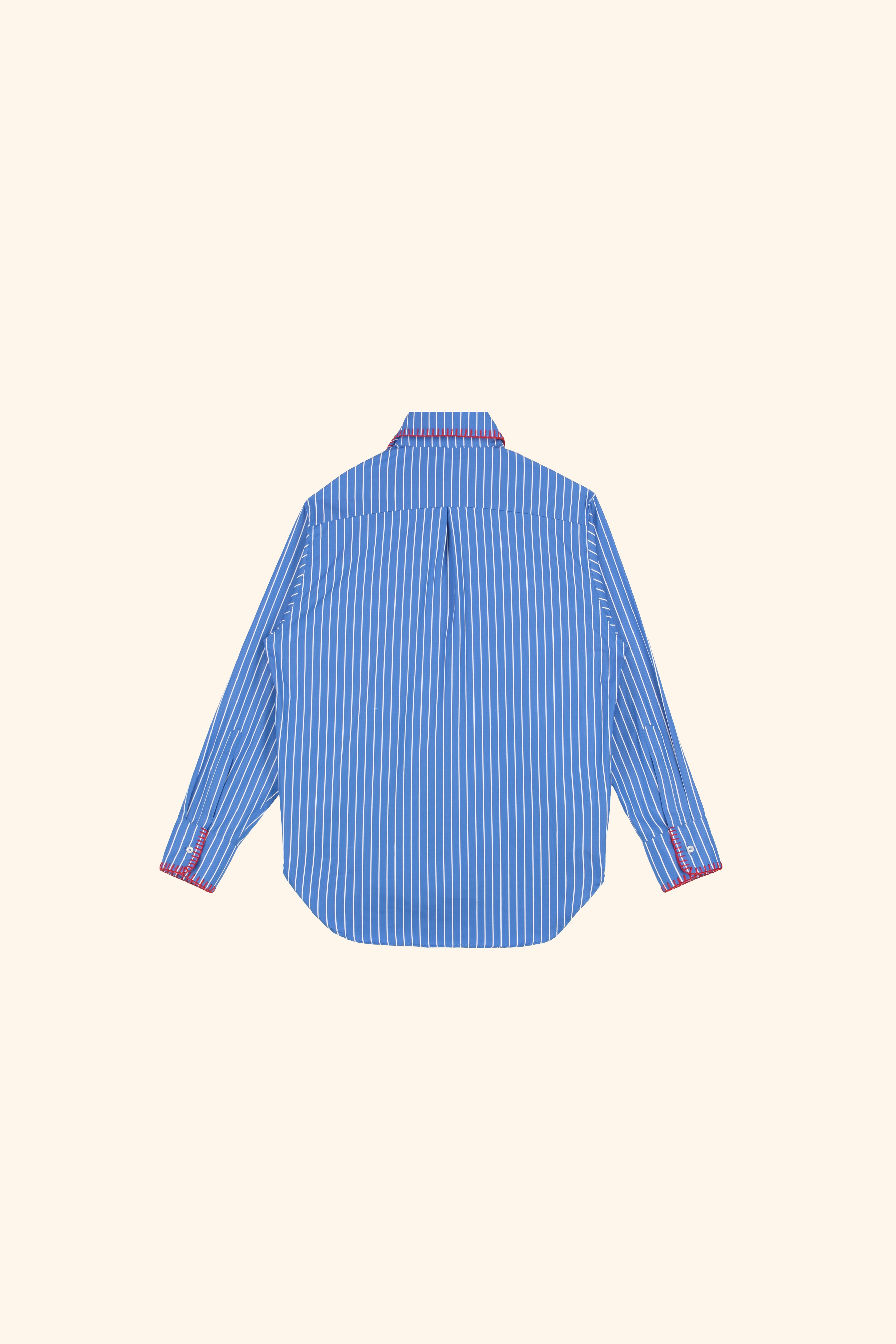 Striped cotton long-sleeved shirt with blanket stitch detail on the collar, placket and cuffs