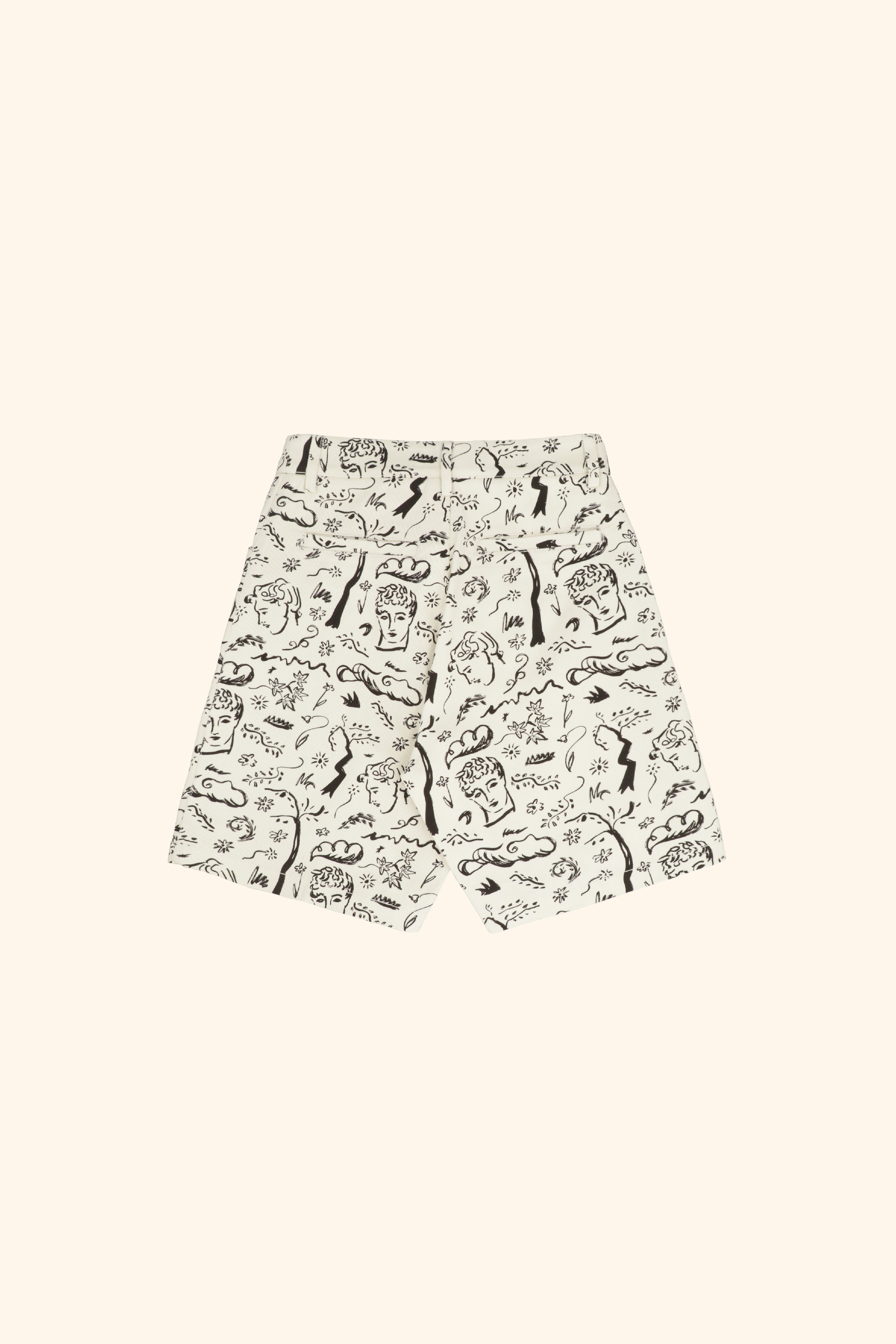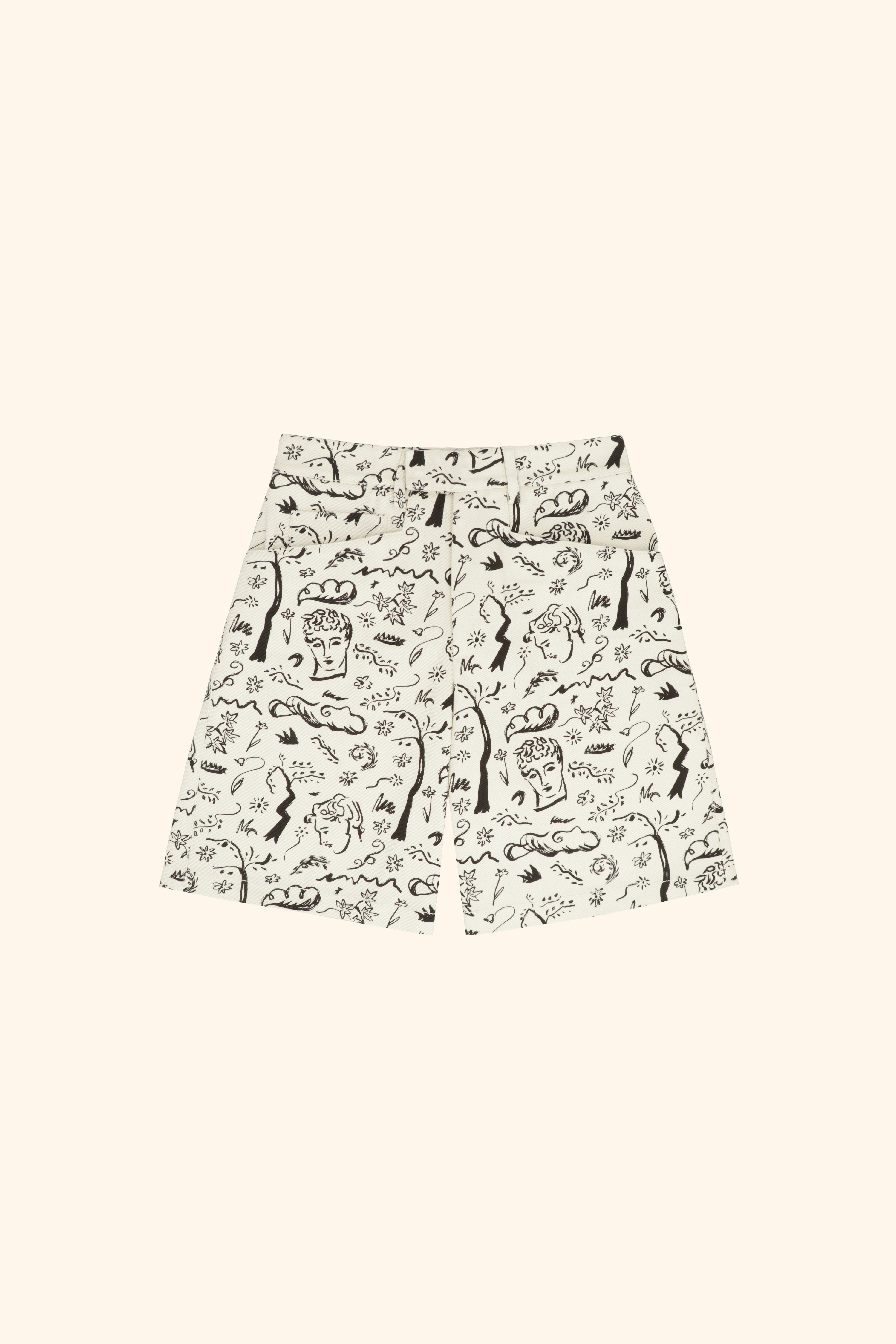 Printed cotton drill shorts with twilight woodland design inspired by the poem Endymion by John Keats