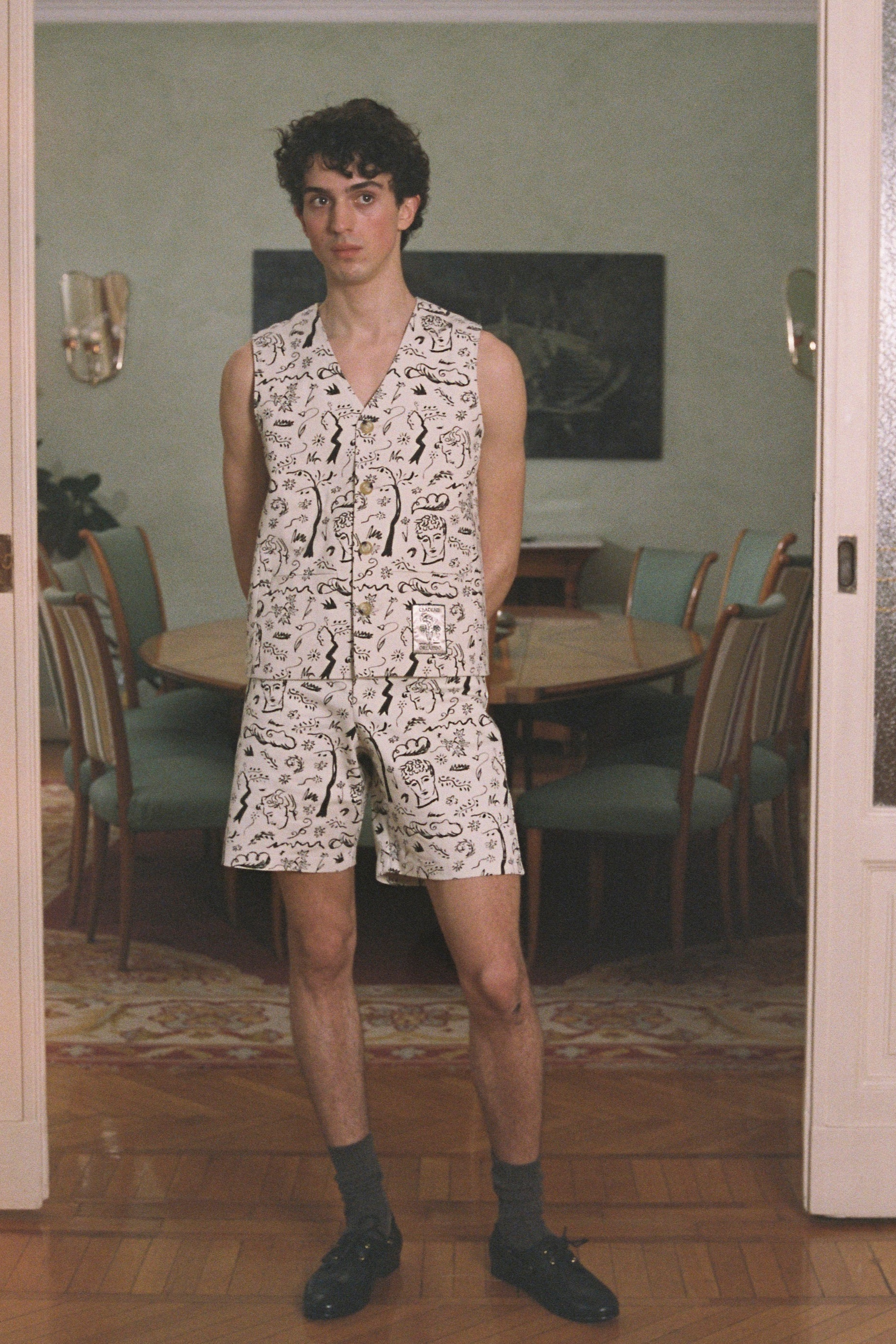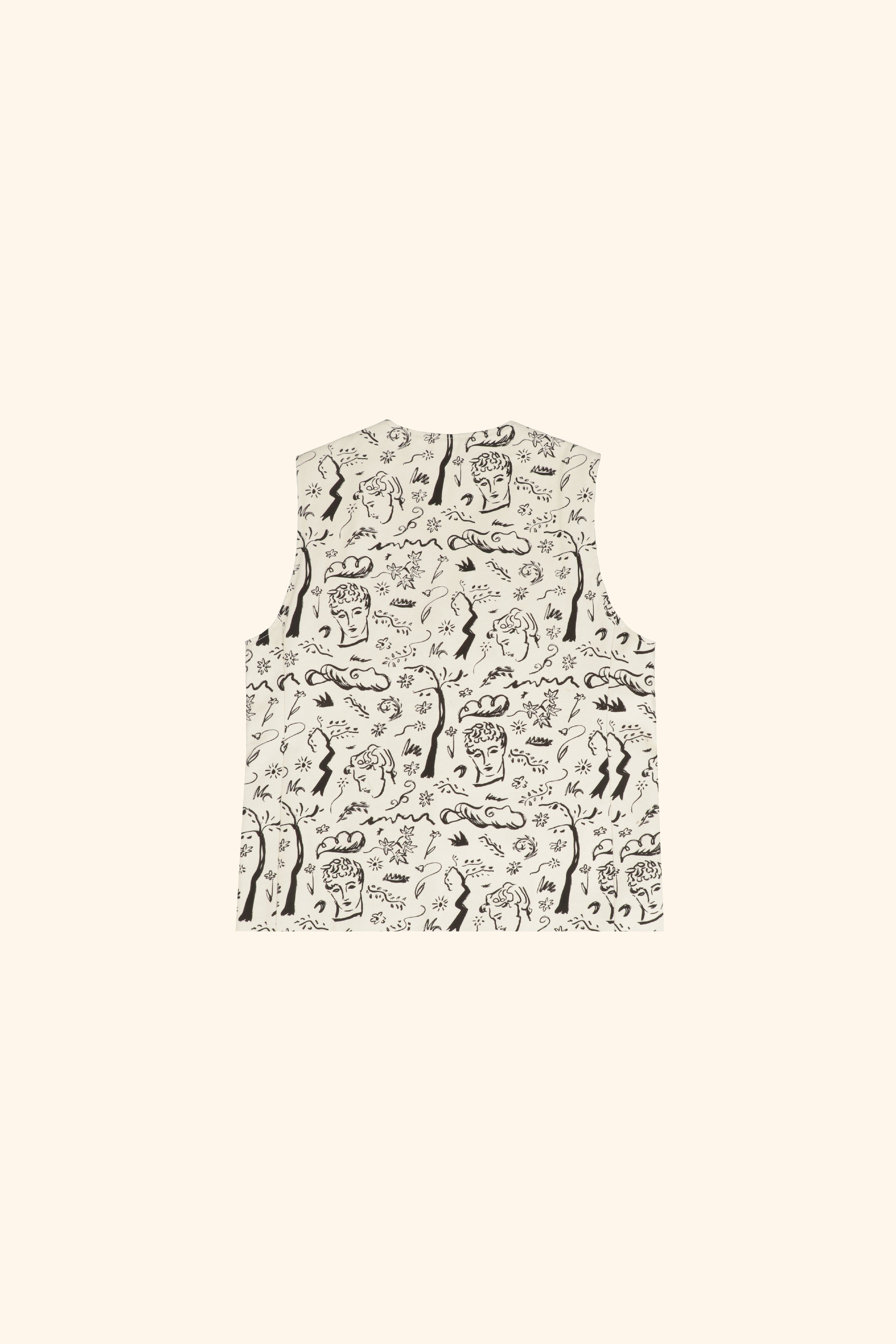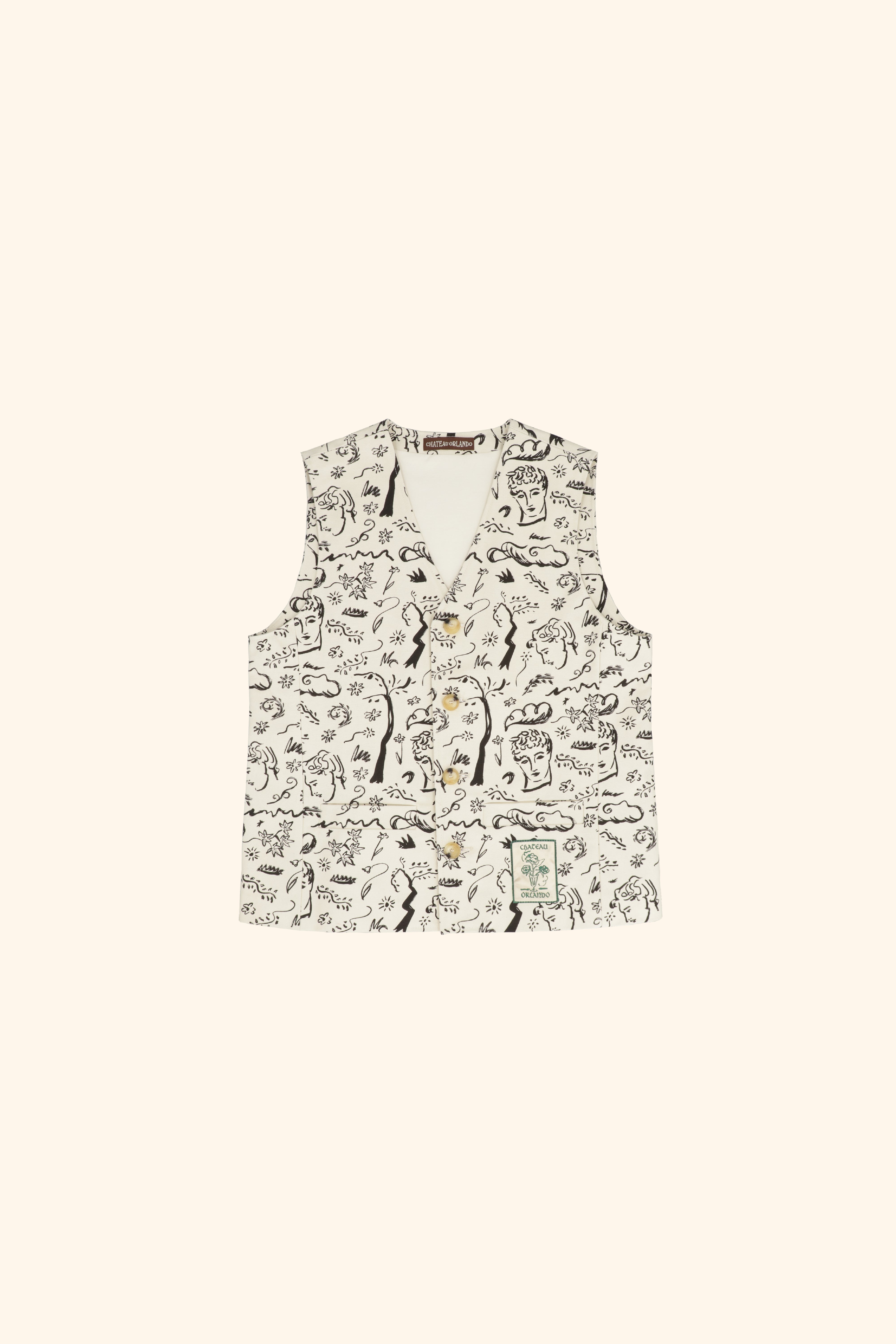 Printed cotton drill waistcoat with twilight woodland design inspired by the poem Endymion by John Keats. A Chateau Orlando vase of roses patch decorates one pocket