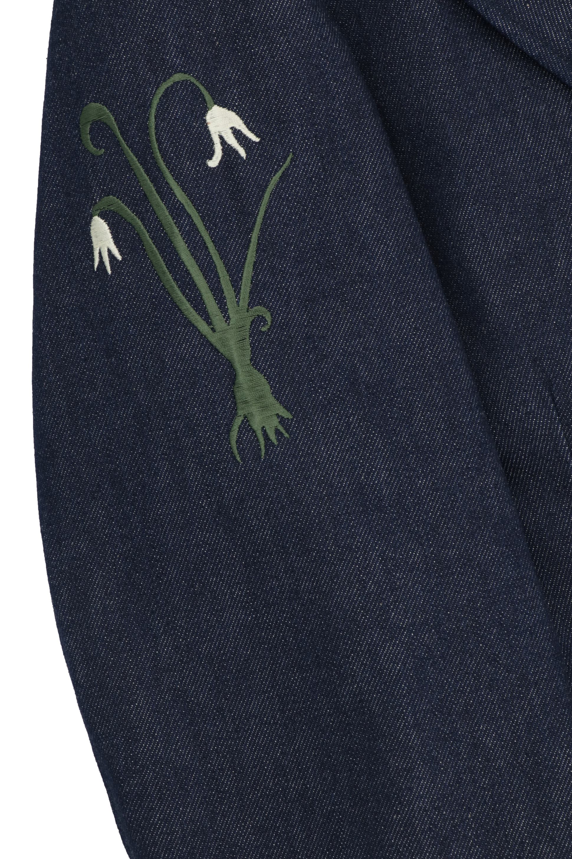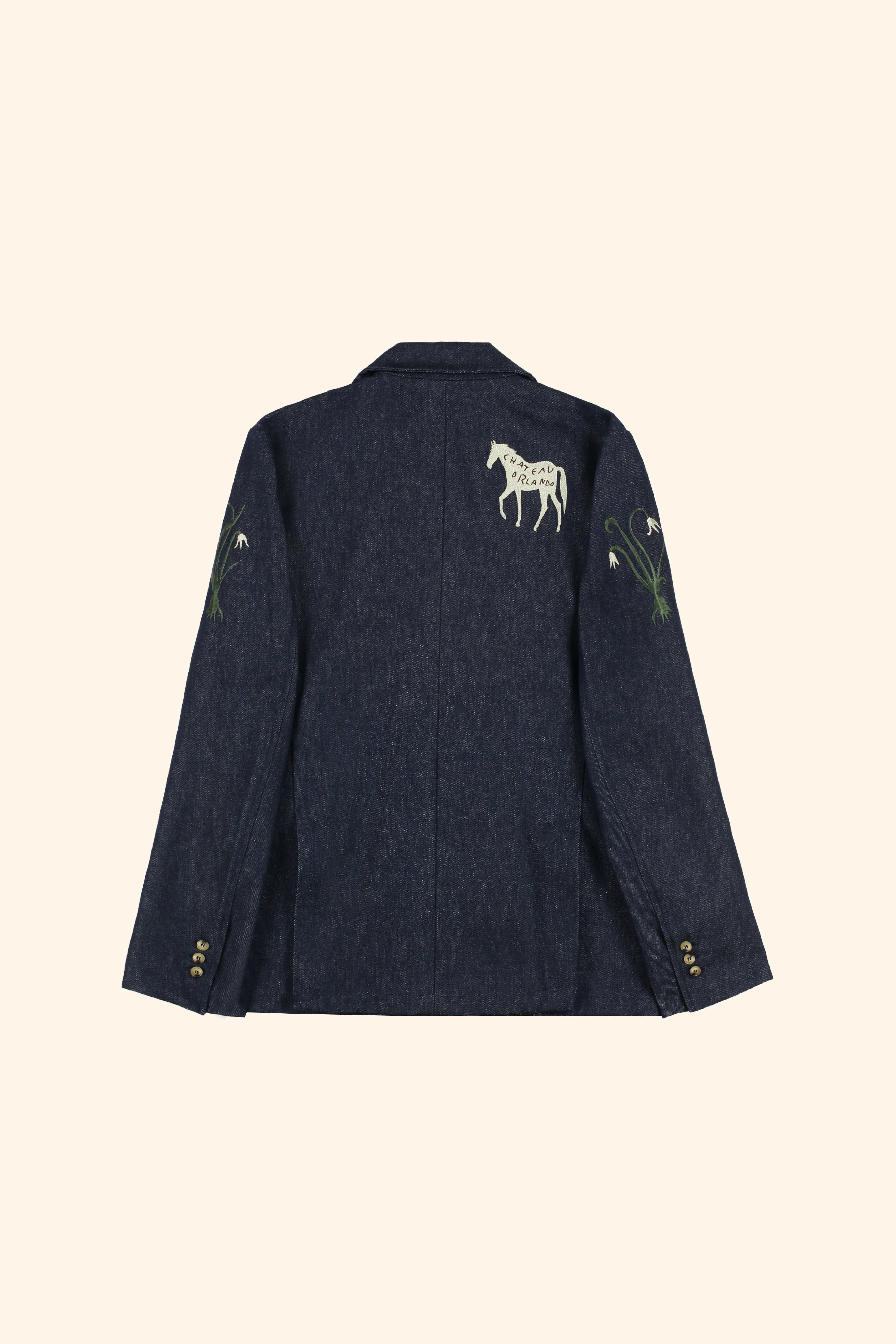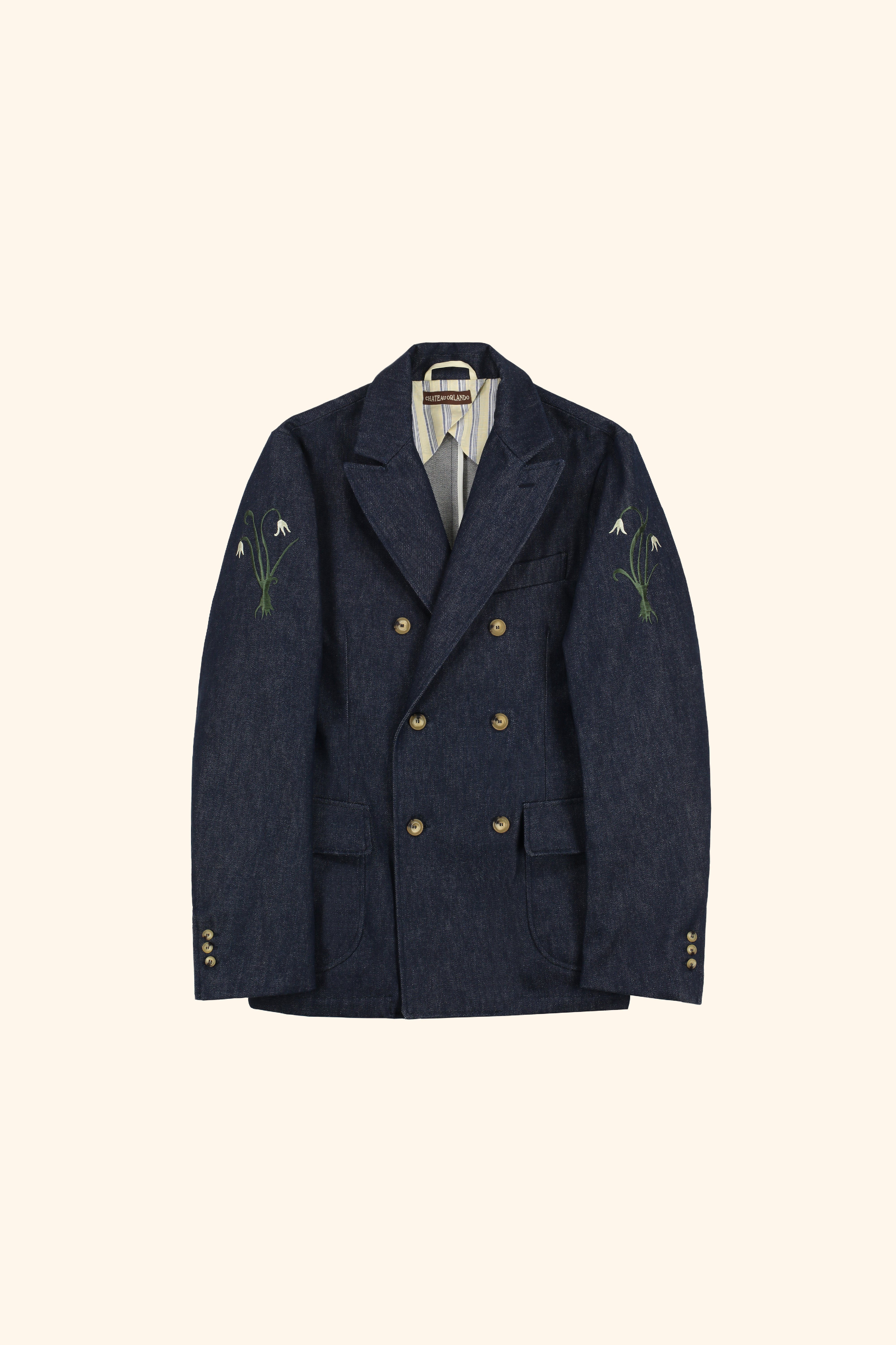 Denim double-breasted blazer with wide lapels, patch pockets and snowdrop embroidery on both sleeves