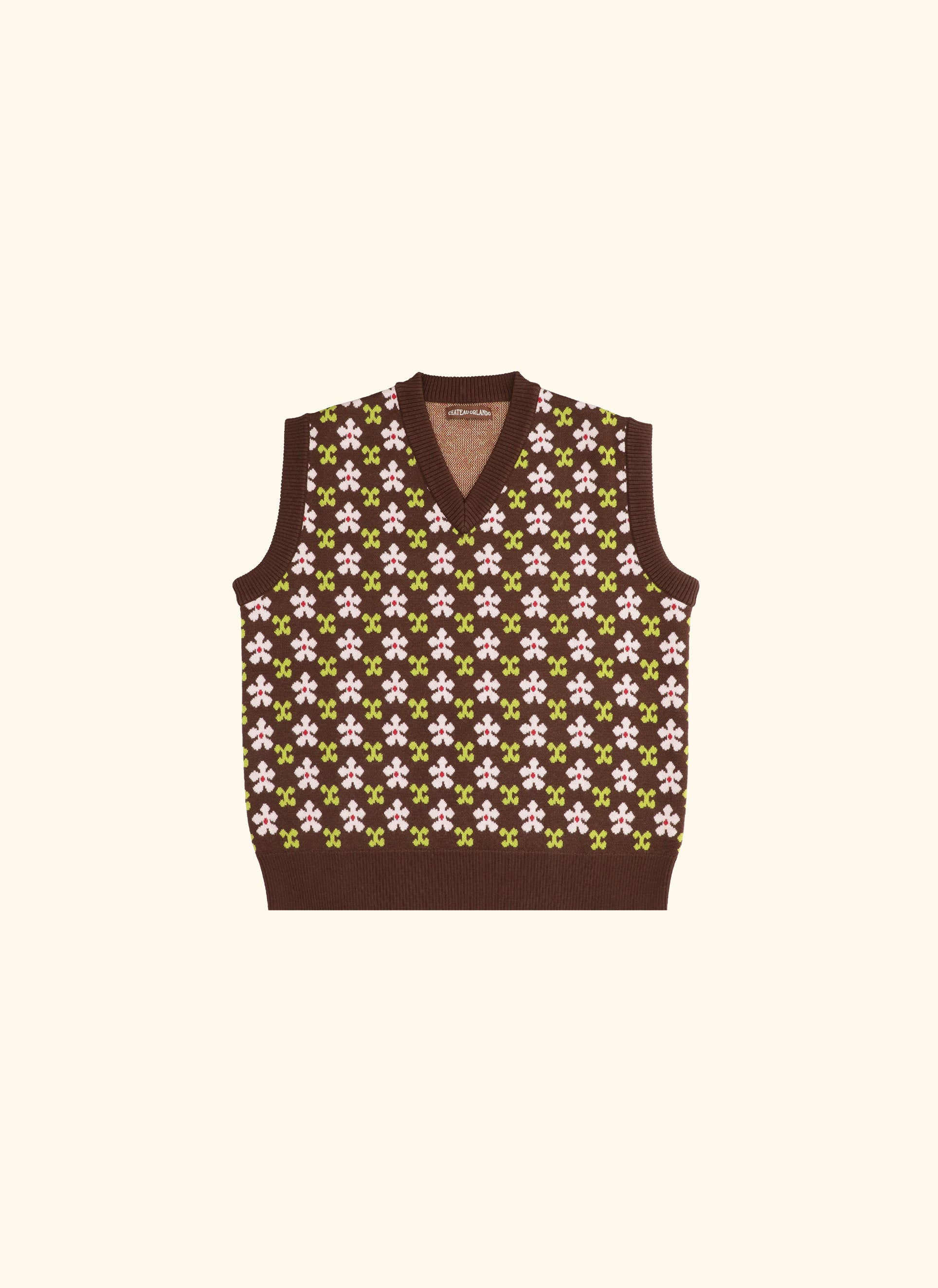 Cotton jacquard V-neck vest with floral design inspired by a church kneeler photographed by Luke