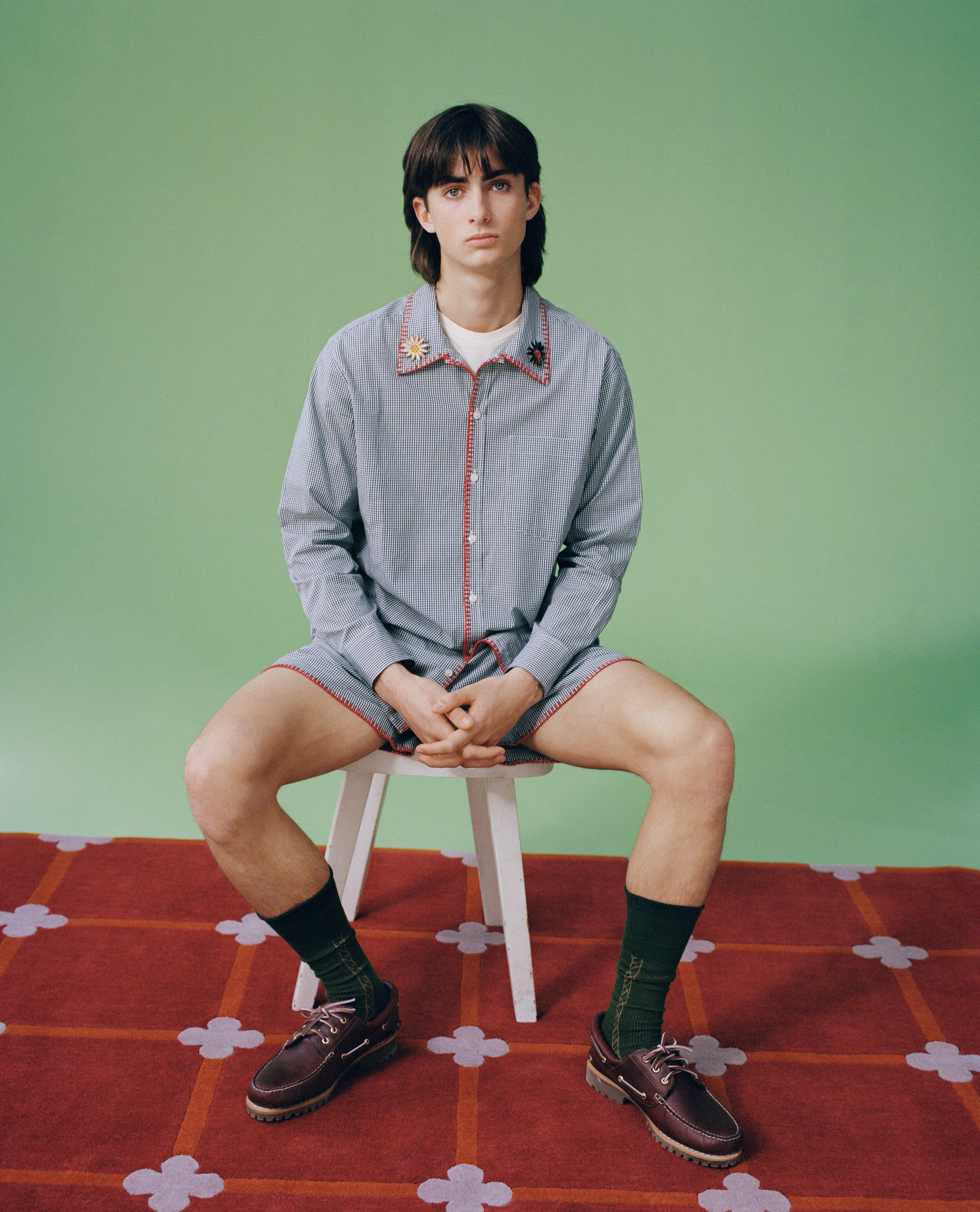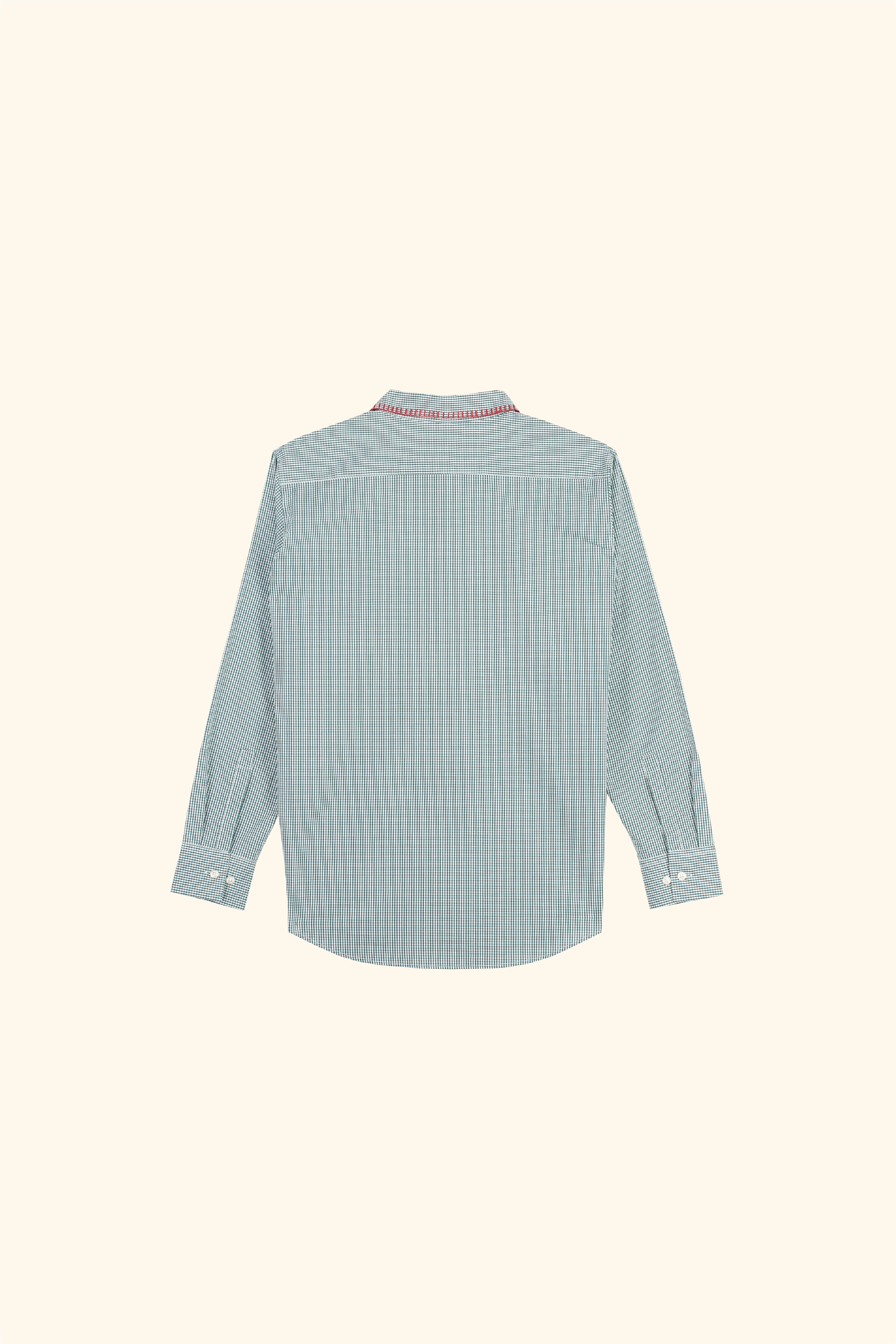 Cotton gingham long-sleeved shirt with blanket stitch detail on the collar and placket