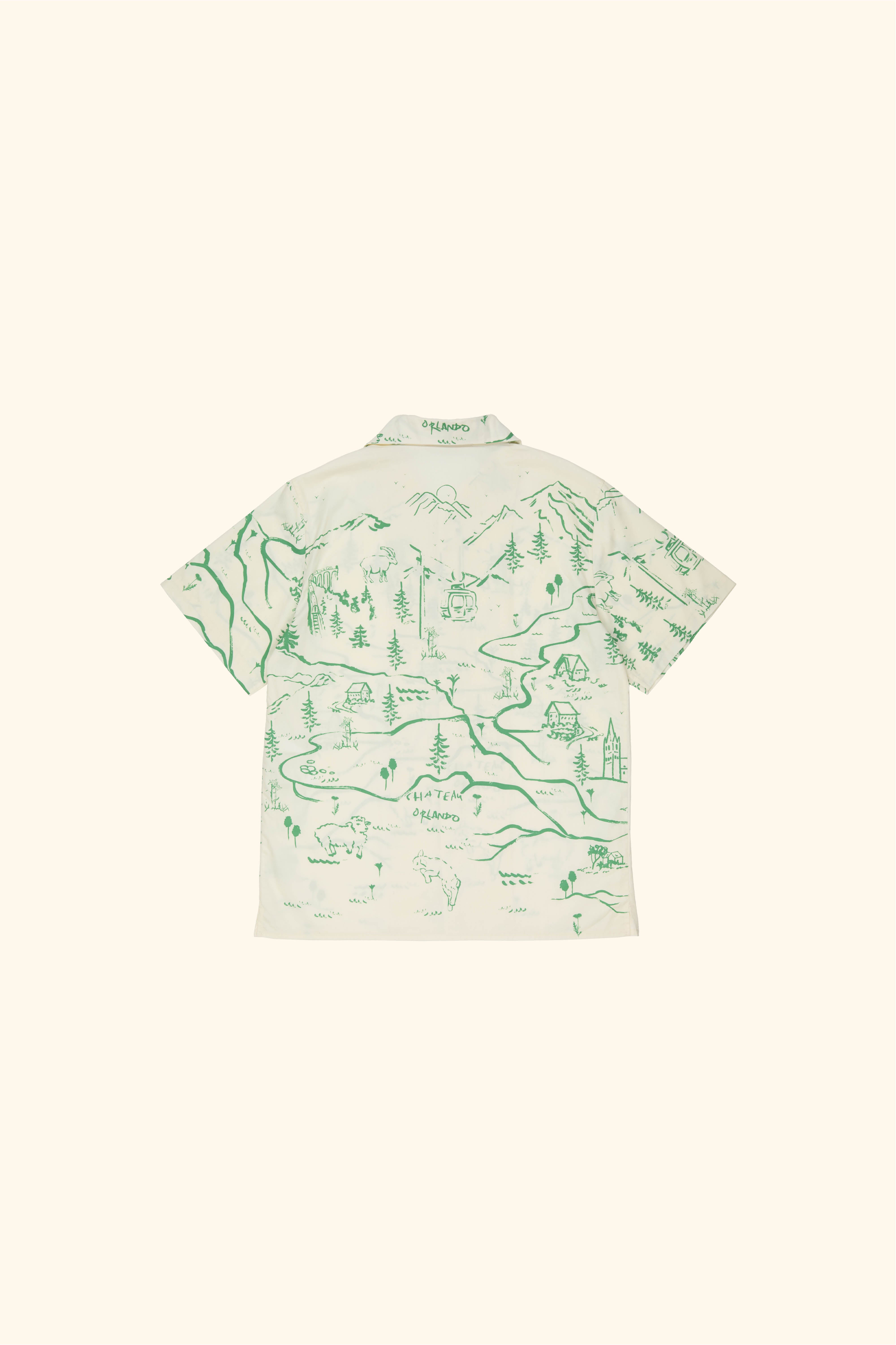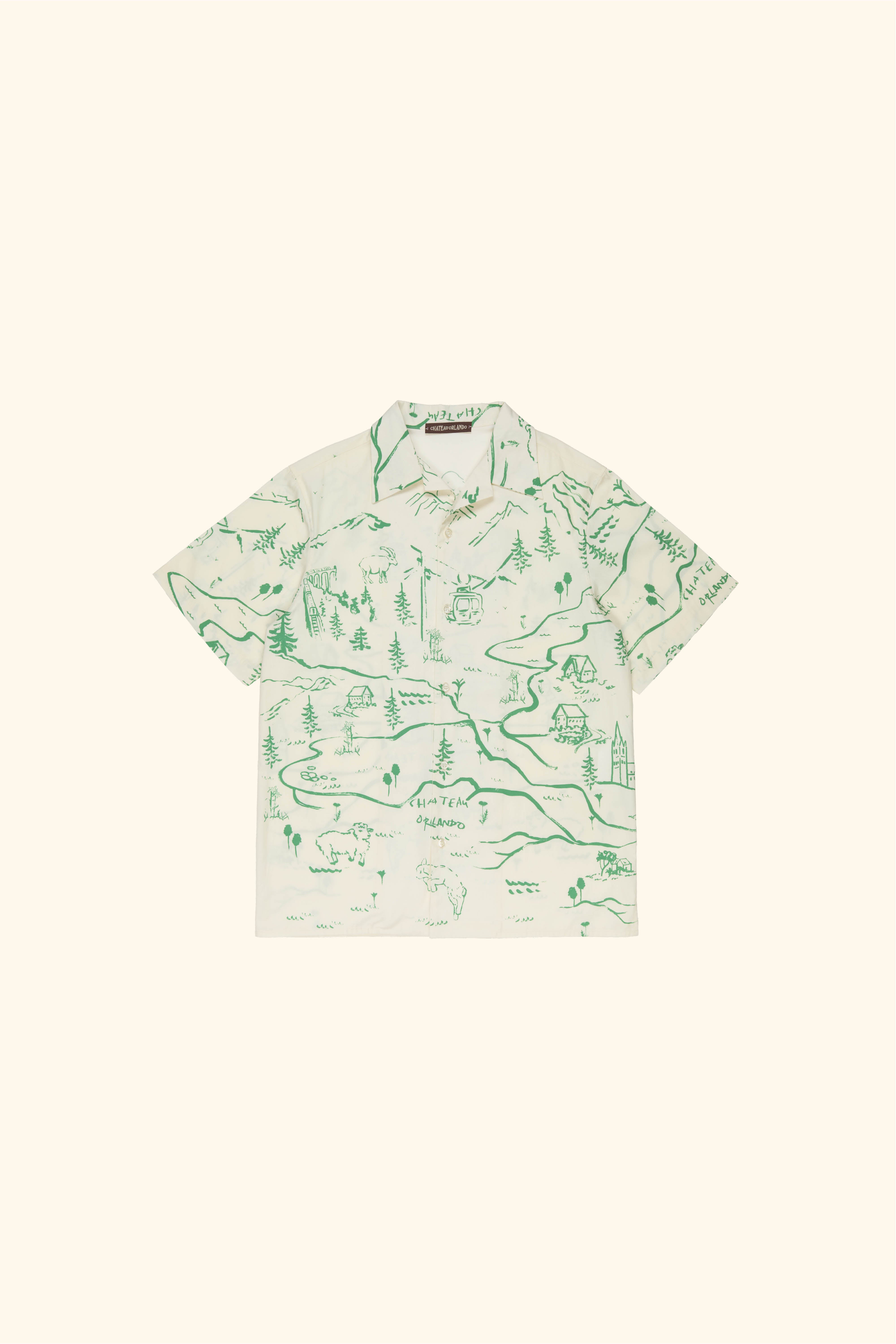 Printed cotton poplin short sleeved shirt with camp collar and design inspired by vintage Swiss tourist maps