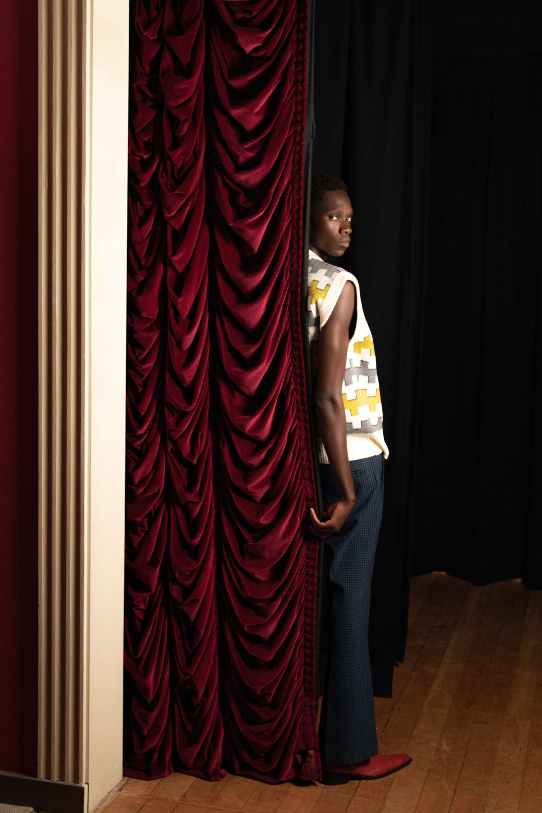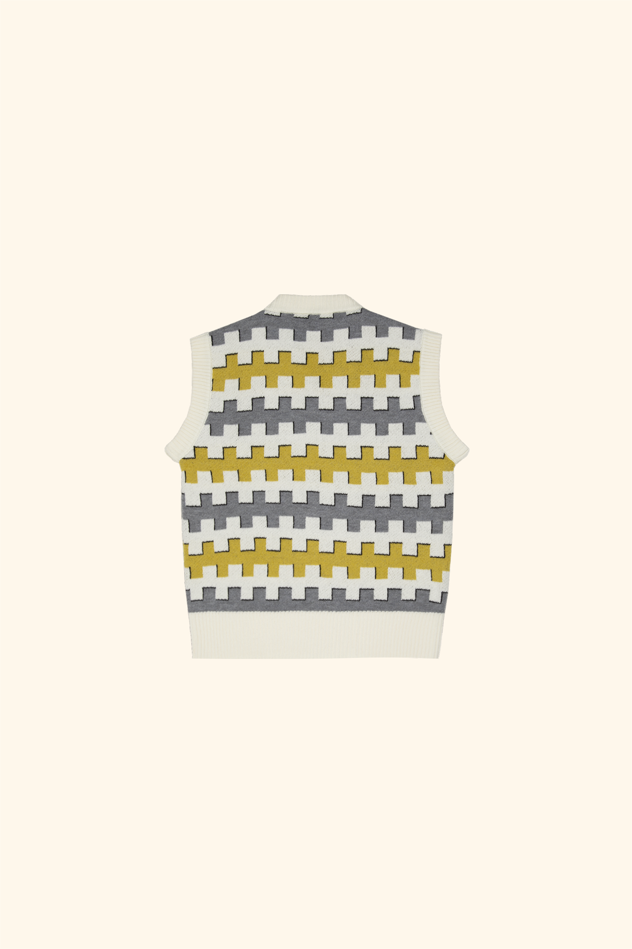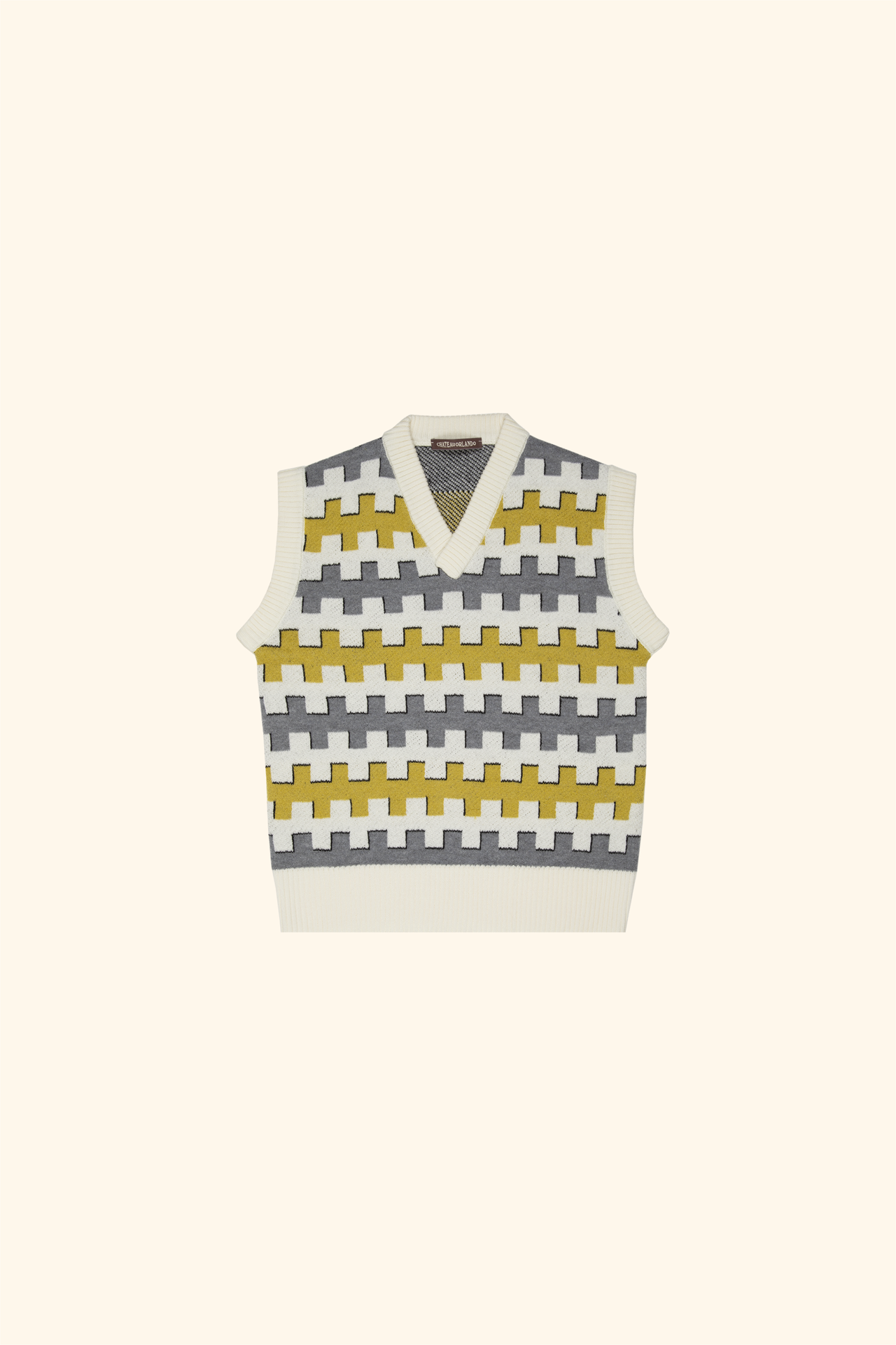 Wool jacquard V-neck vest with design inspired by the architecture of medieval English castles