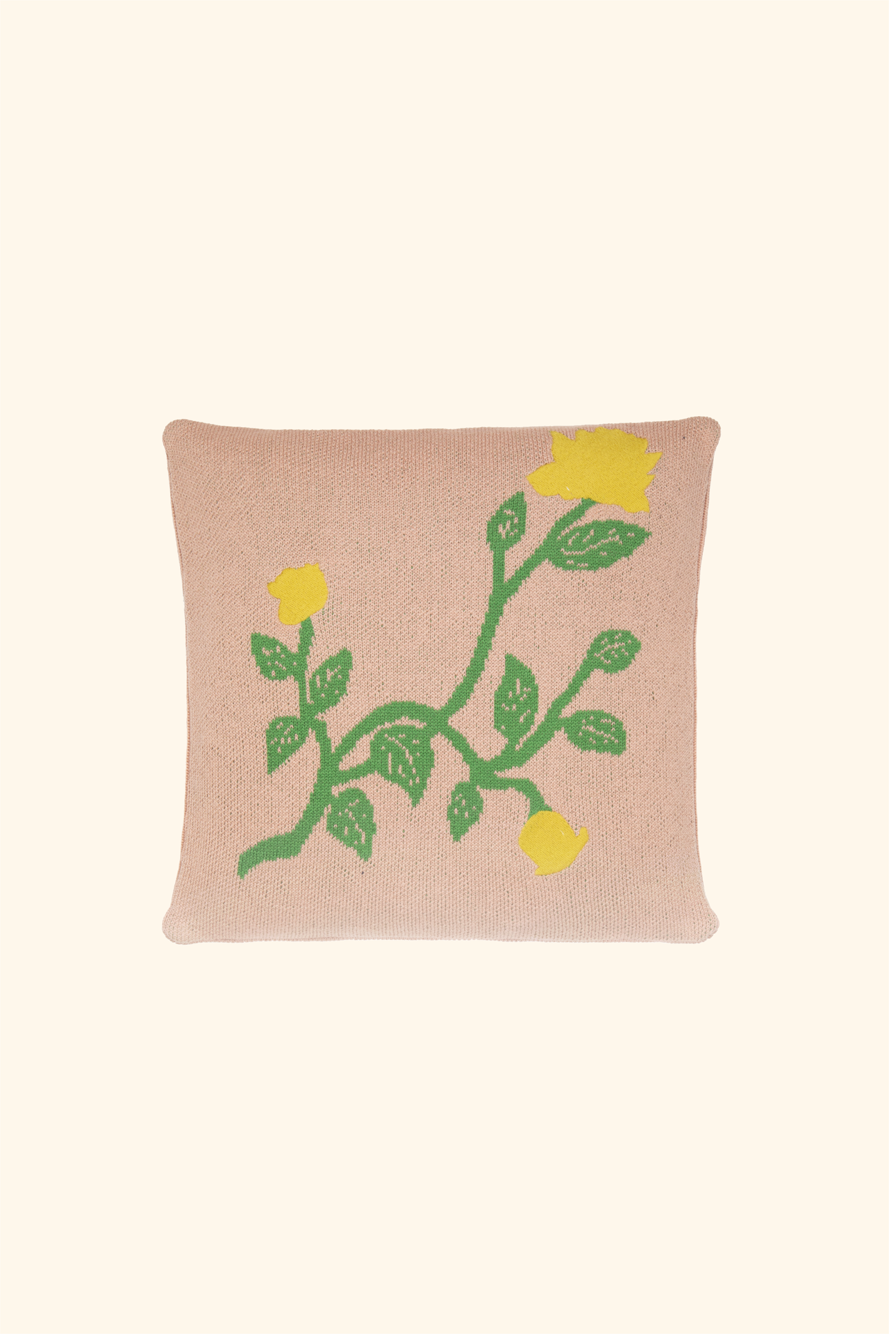Wool jacquard cushion cover with embroidery inspired by the yellow Vanessa Bell roses Luke grows in his country garden