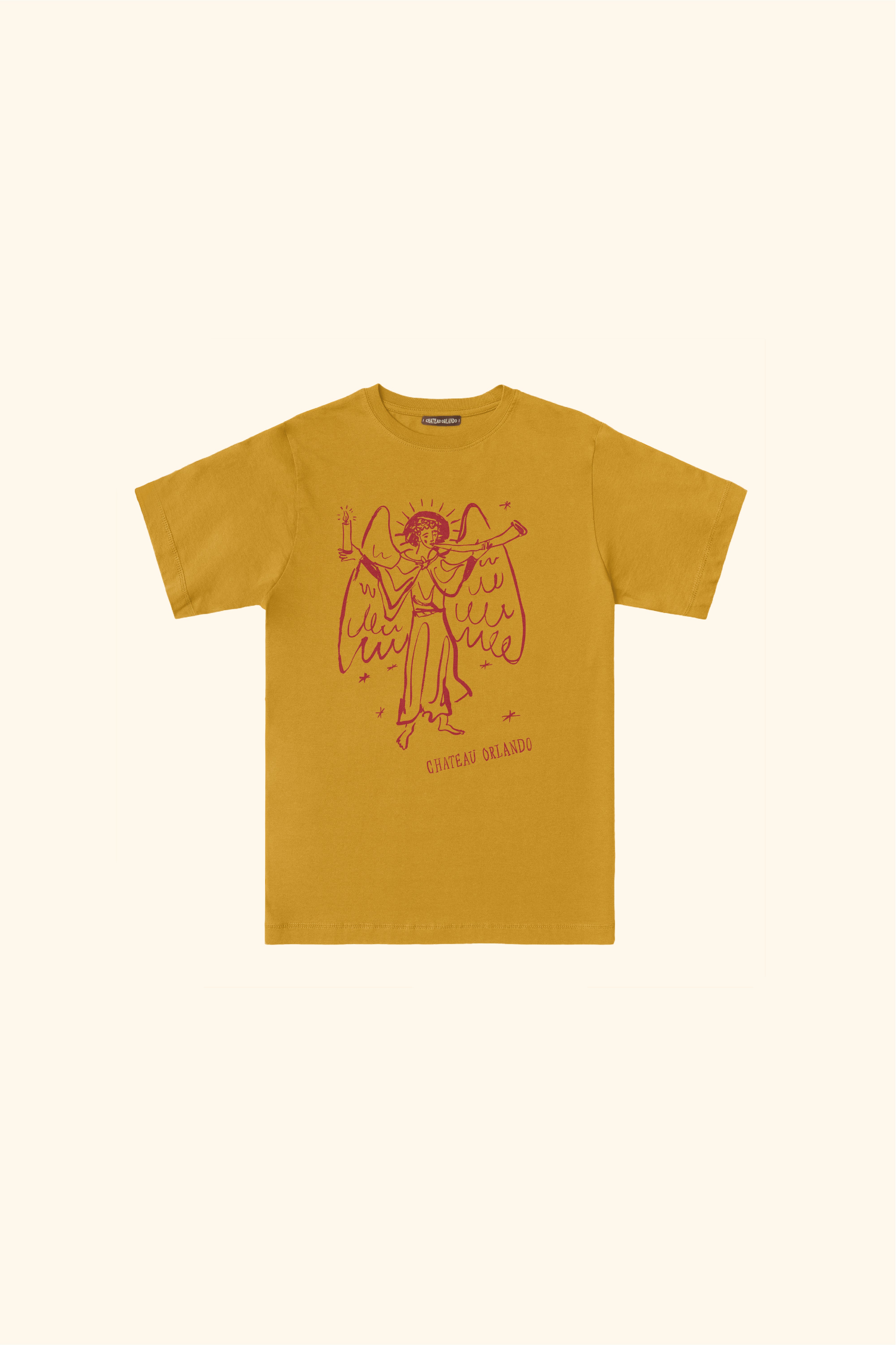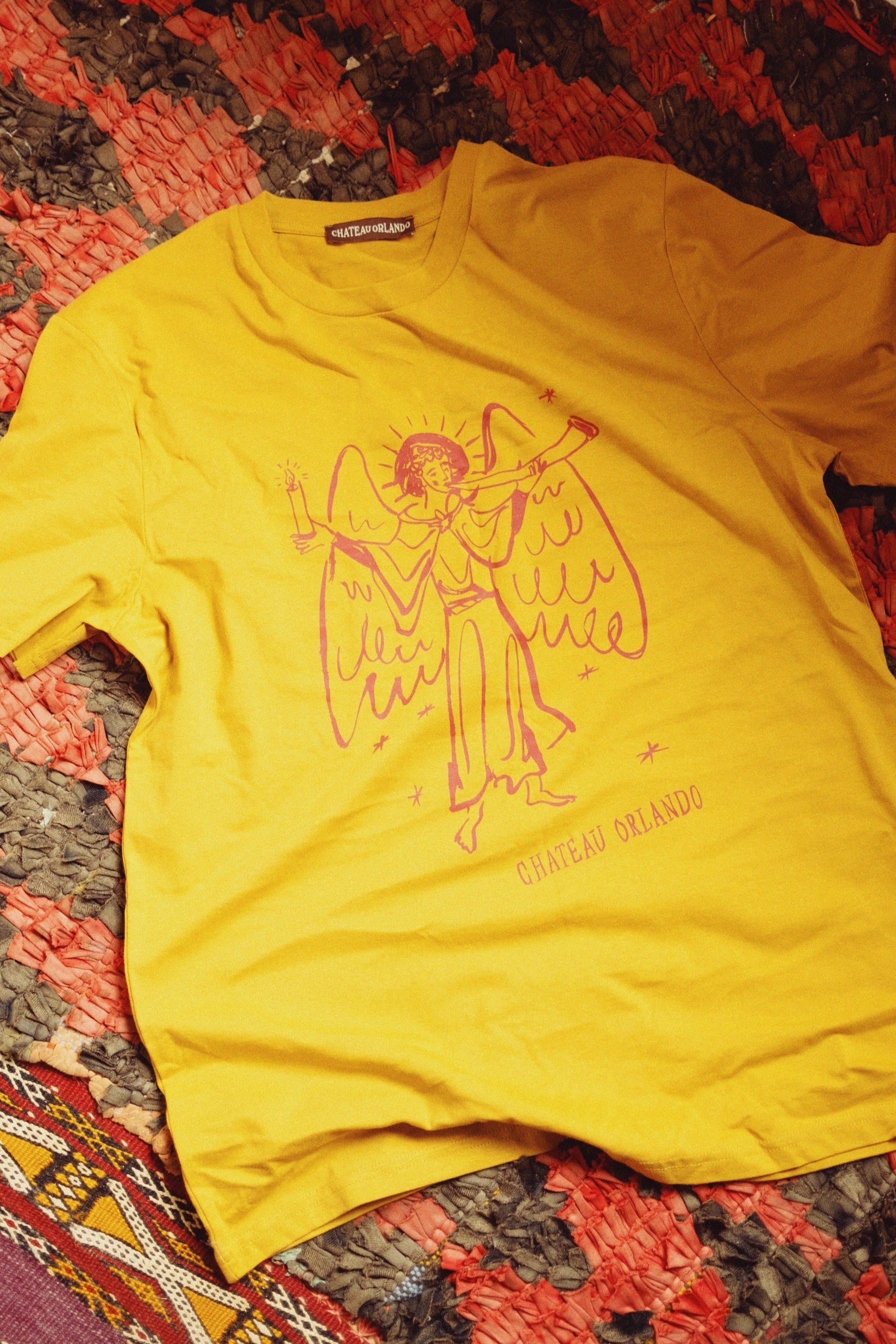 Printed cotton jersey t-shirt with heralding Christmas angel design inspired by medieval illustrations