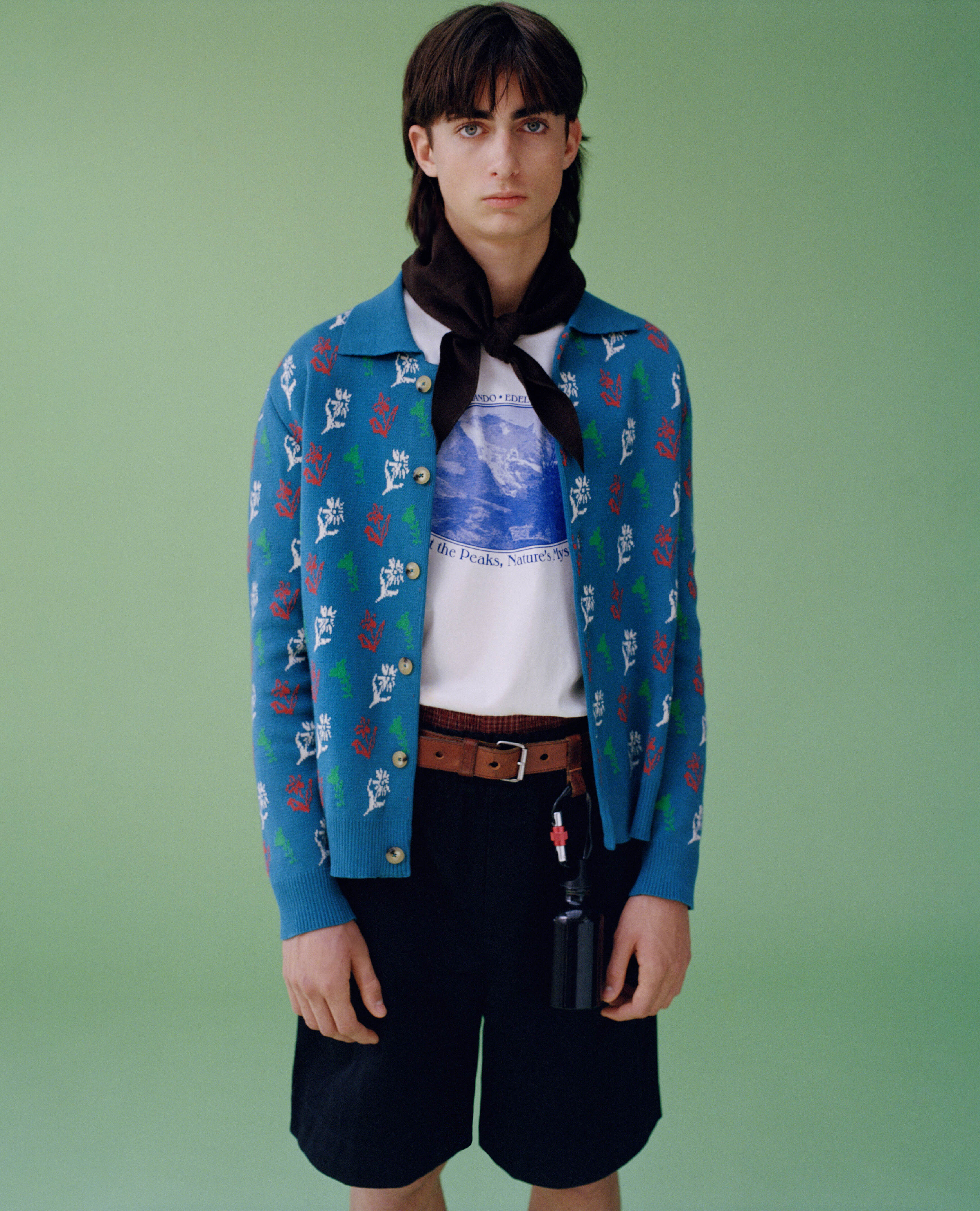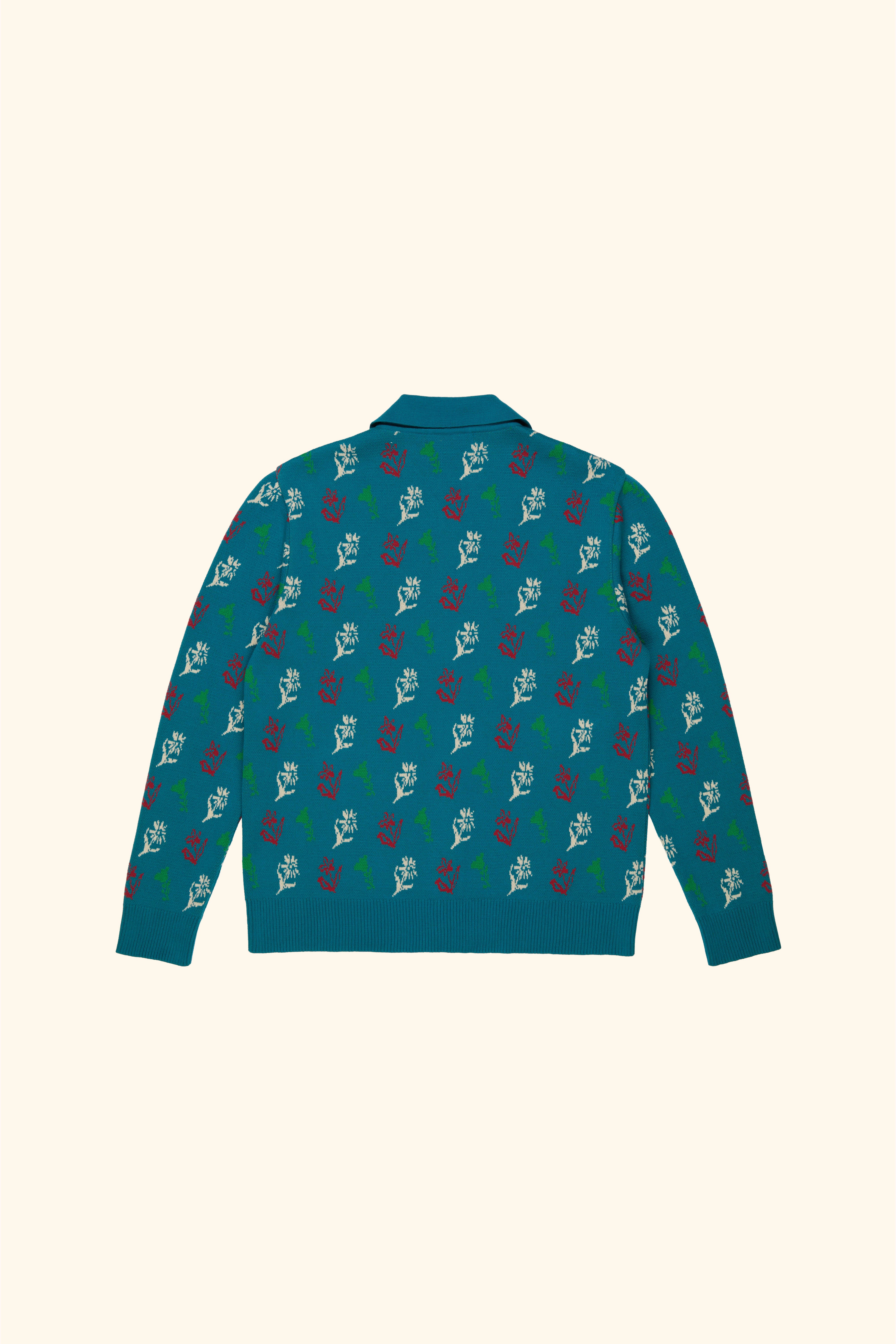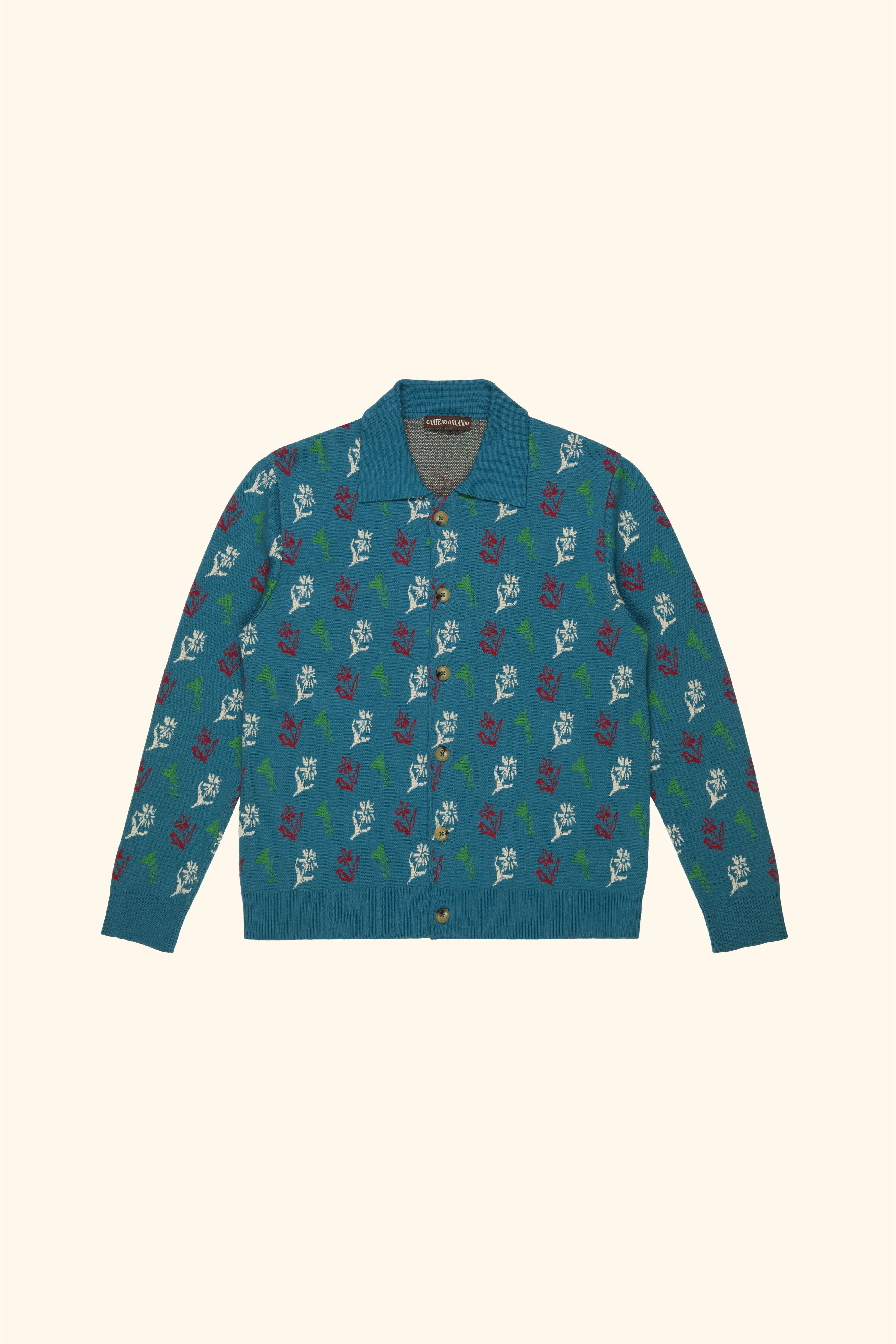 Cotton jacquard polo cardigan with design inspired by traditional Tyrolean knitwear and alpine wildflowers