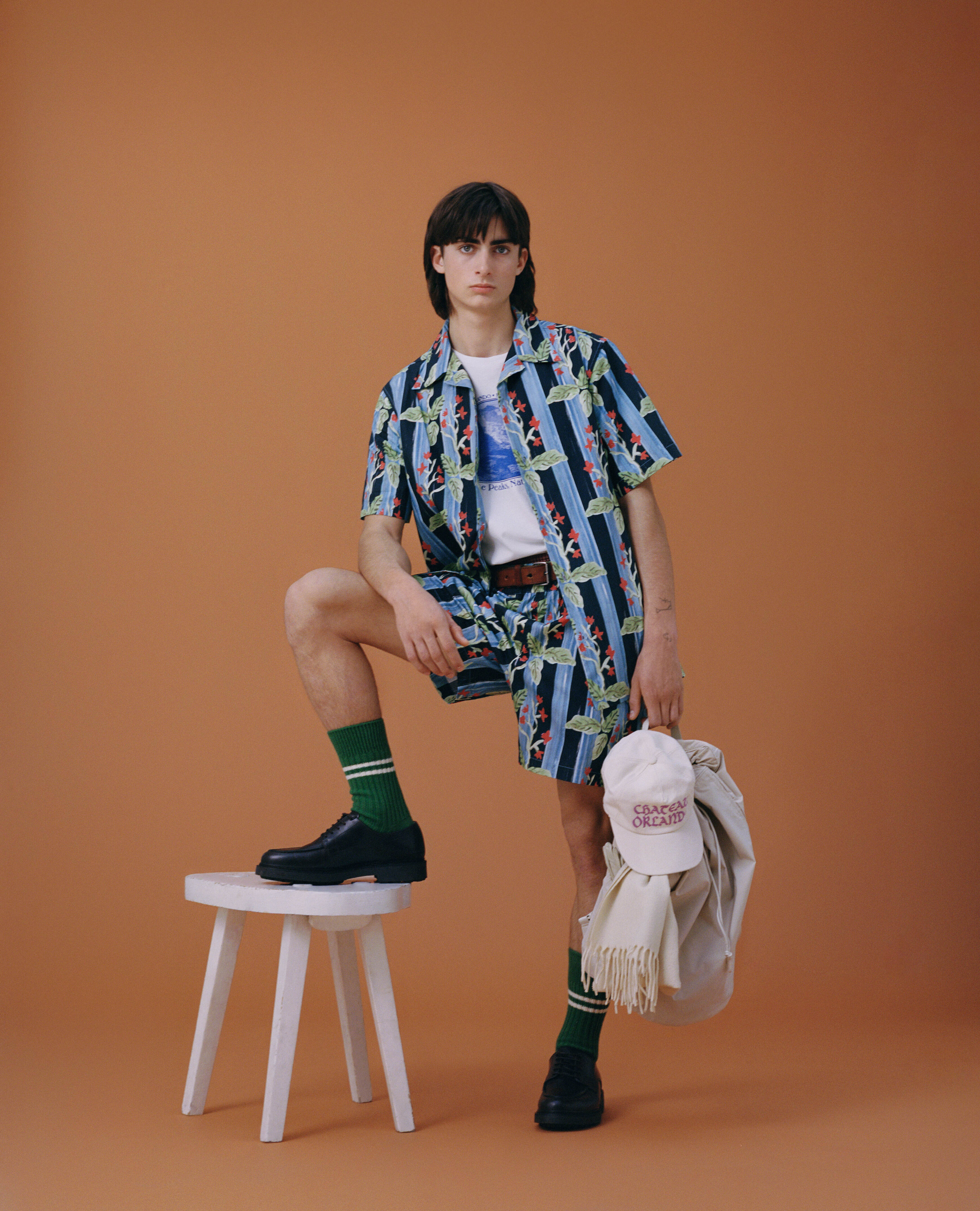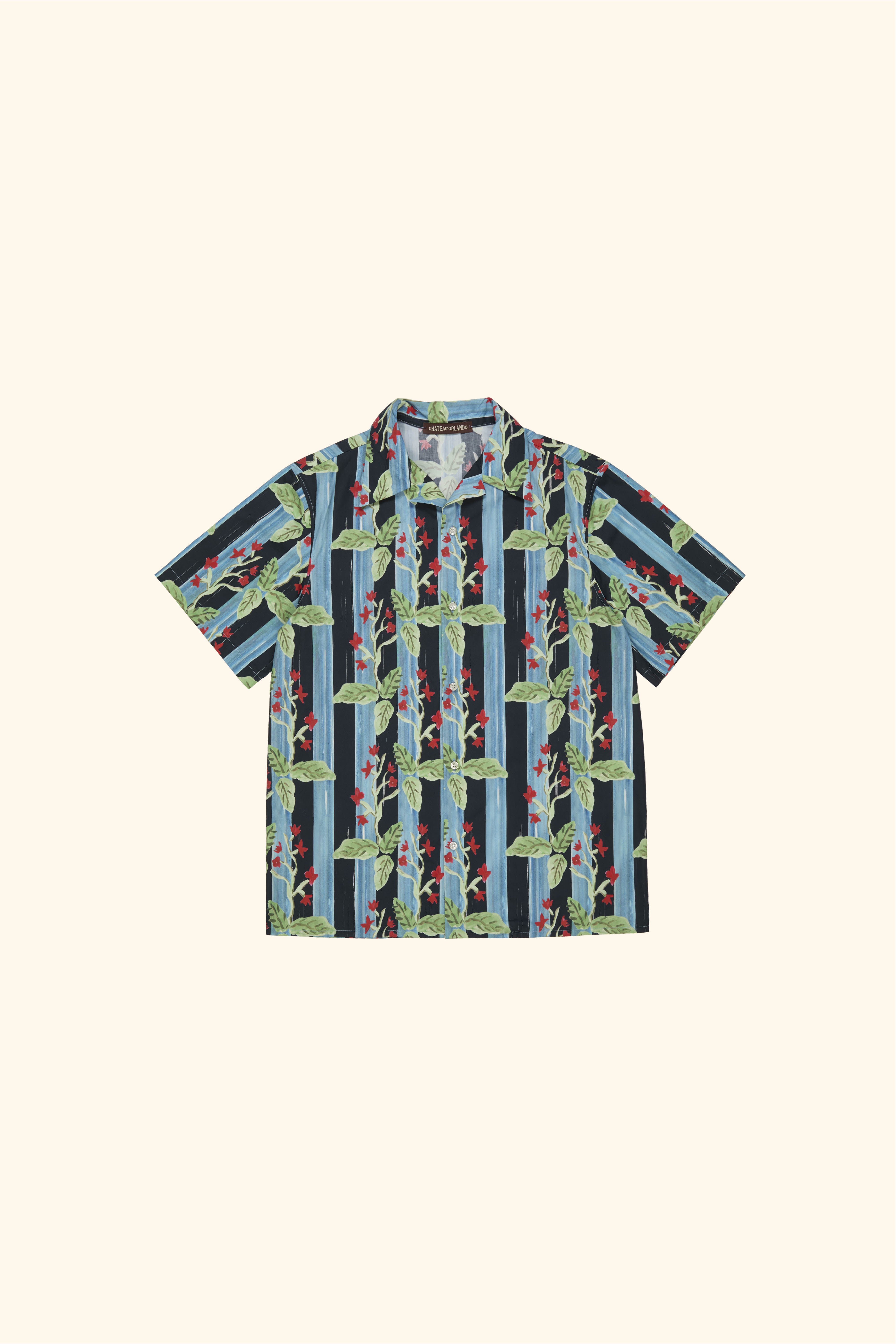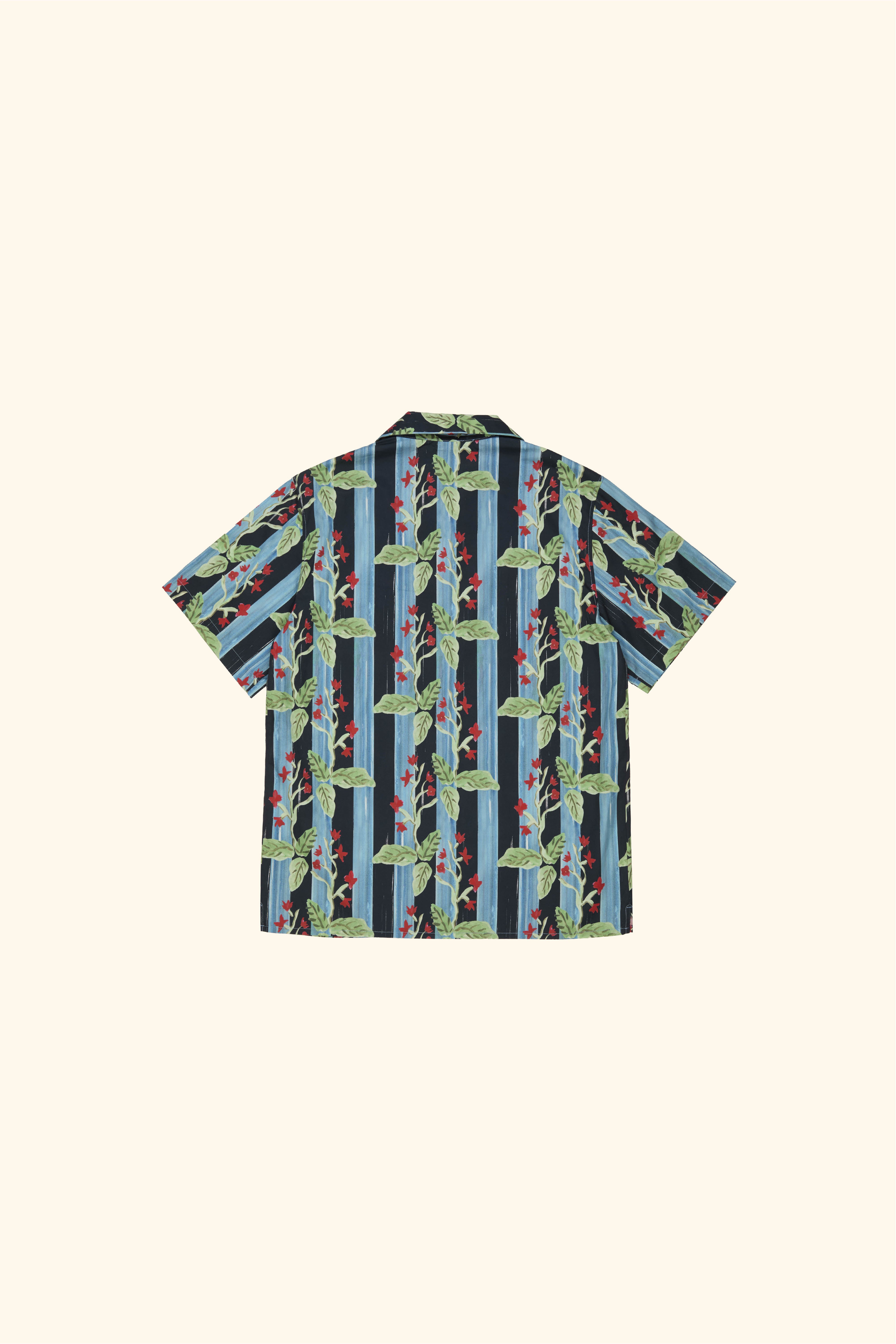 Printed cotton poplin short-sleeved shirt with camp collar and design inspired by alpine barrenwort, a species of flowering plant native to the mountains of Italy, Austria and other European countries