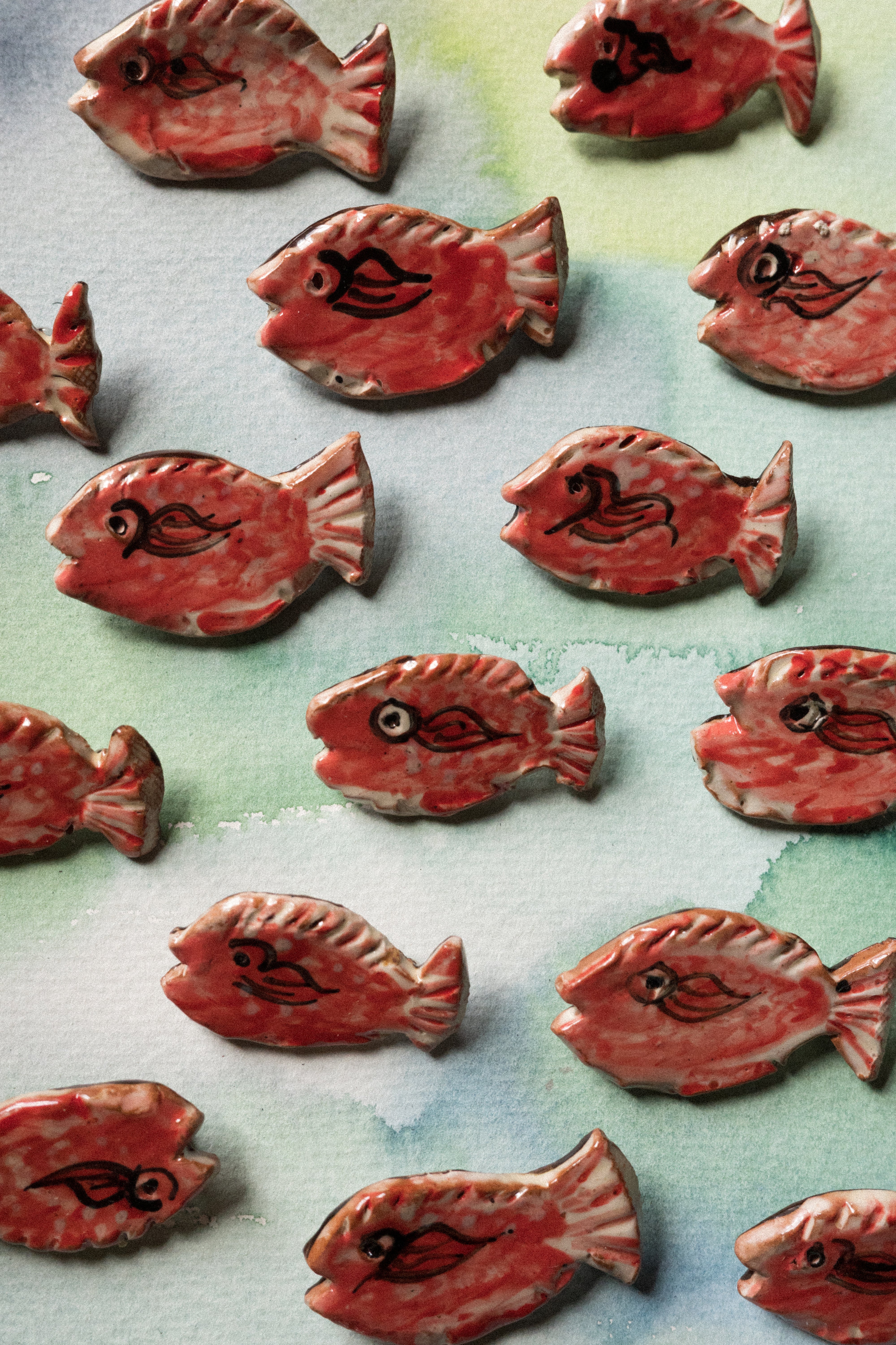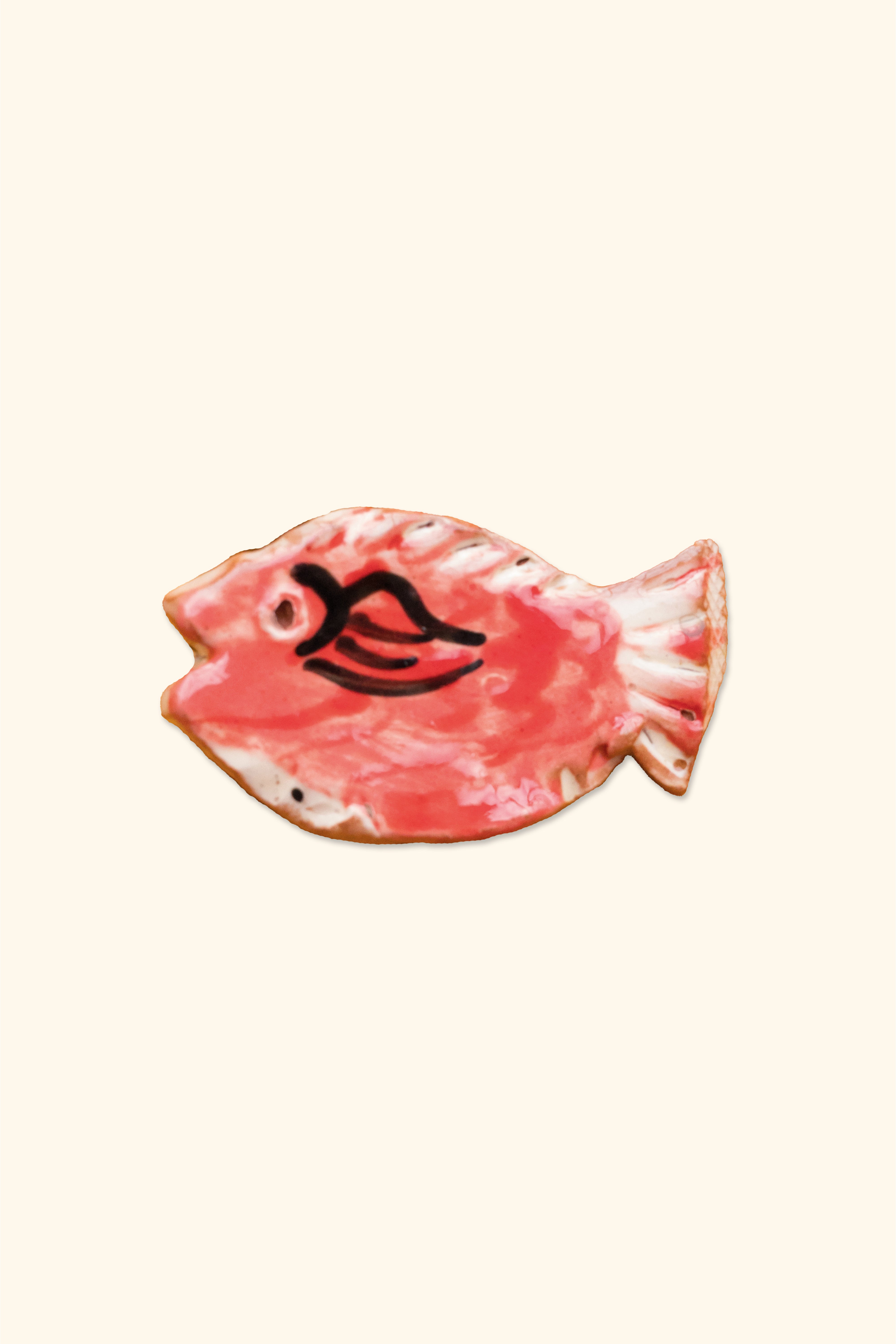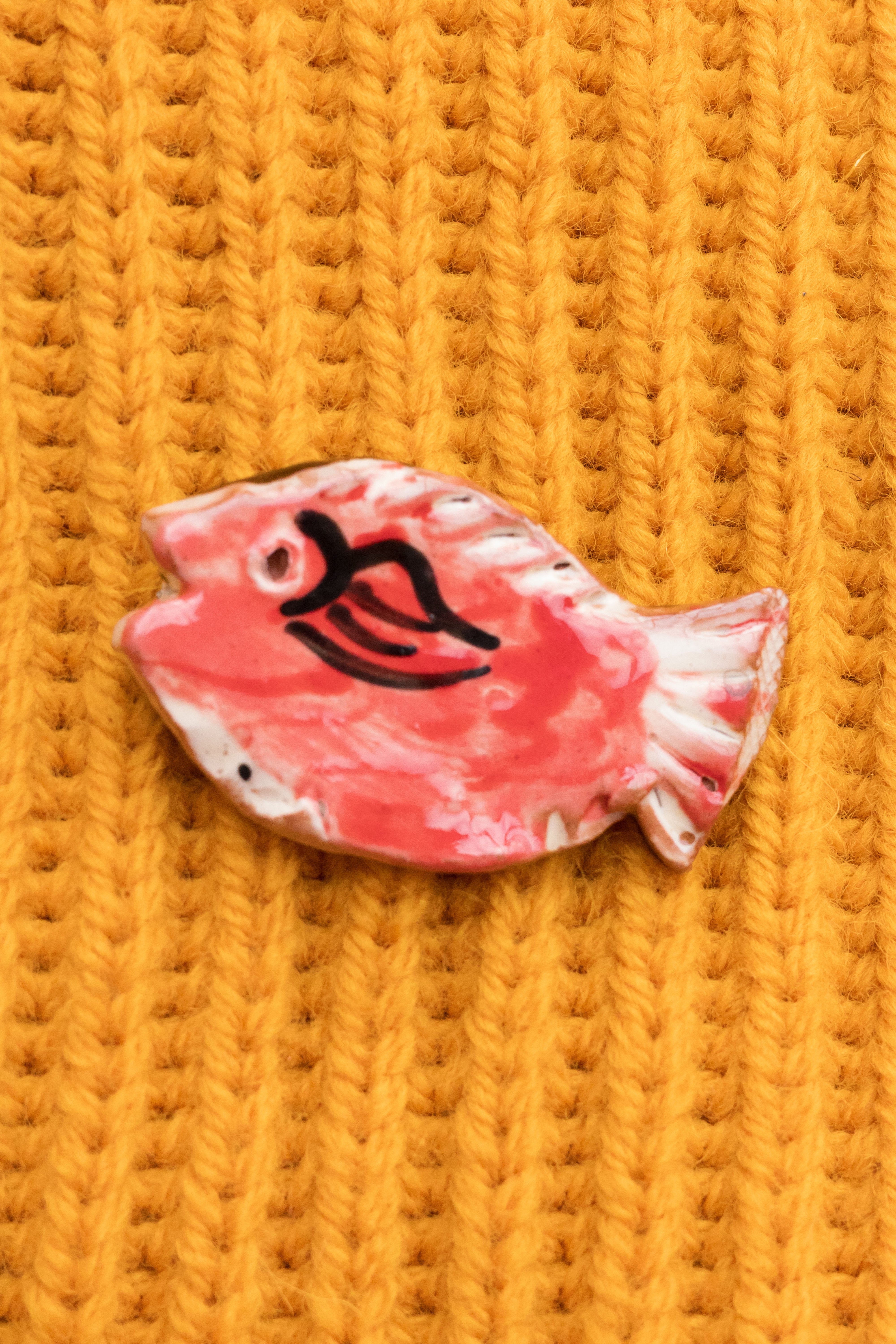Earthenware brooch with fish design made by Jenny Knight, a Gloucestershire-based studio potter and artist