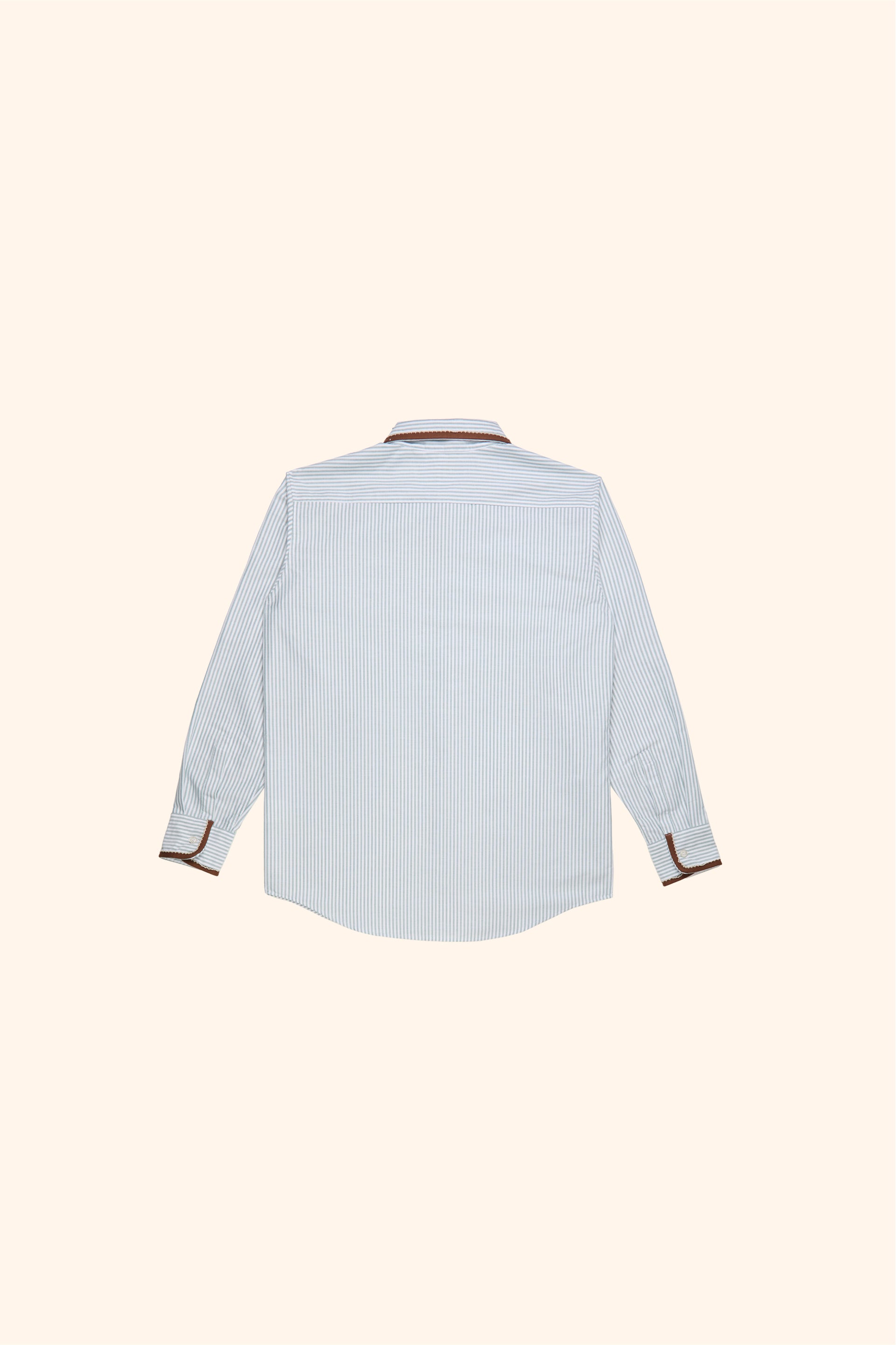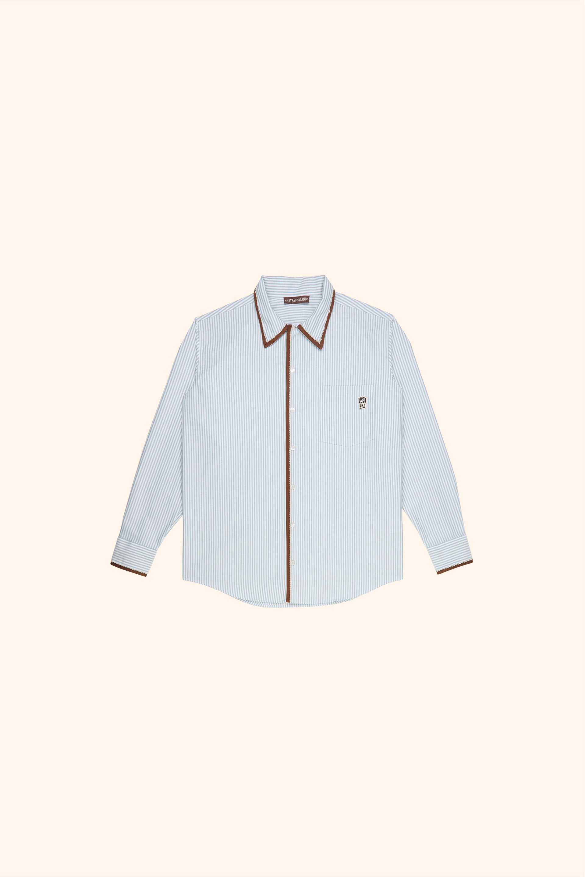 Striped cotton long-sleeved shirt with decorative brown trim on the collar and placket. A small Chateau Orlando Pan patch decorates the chest