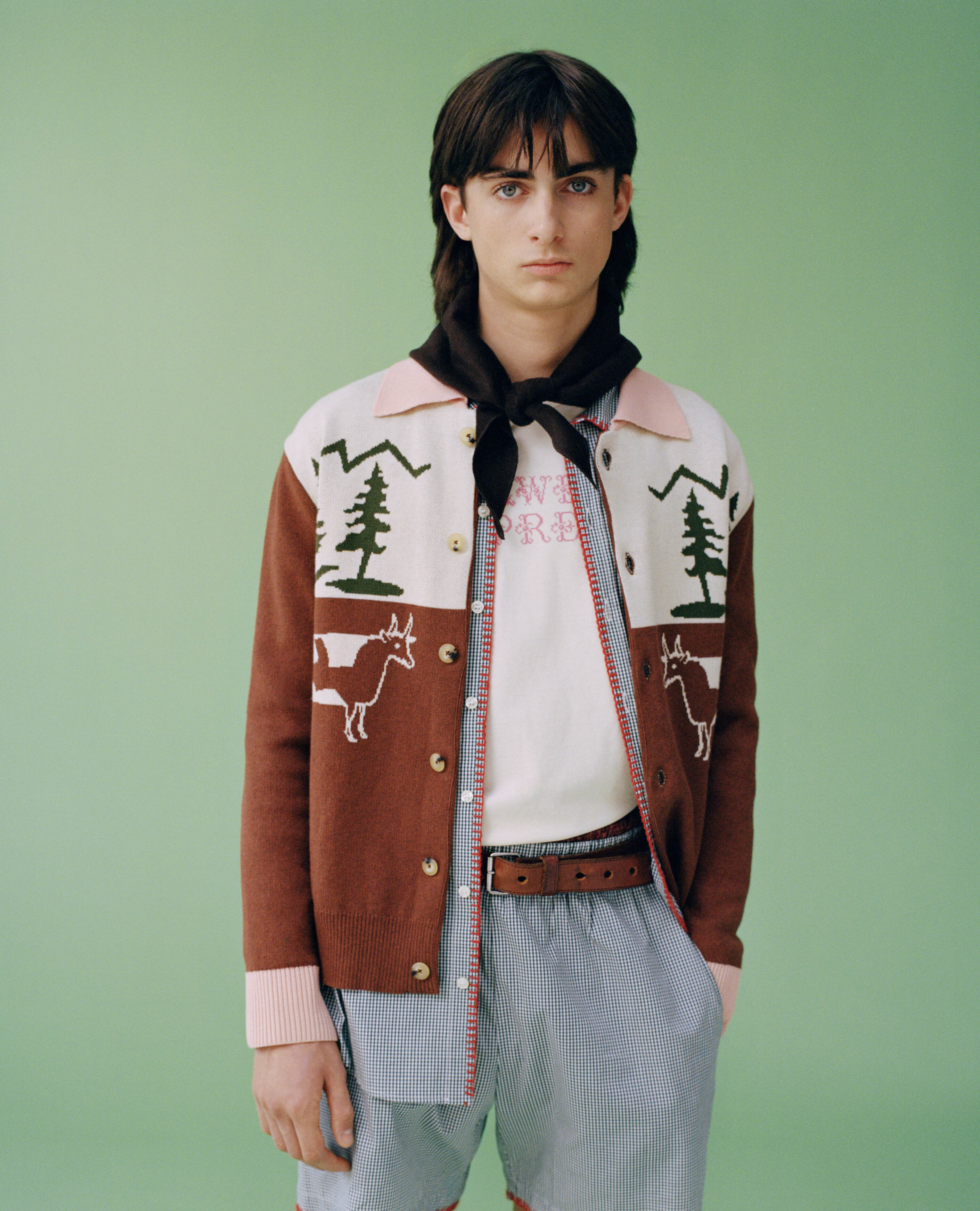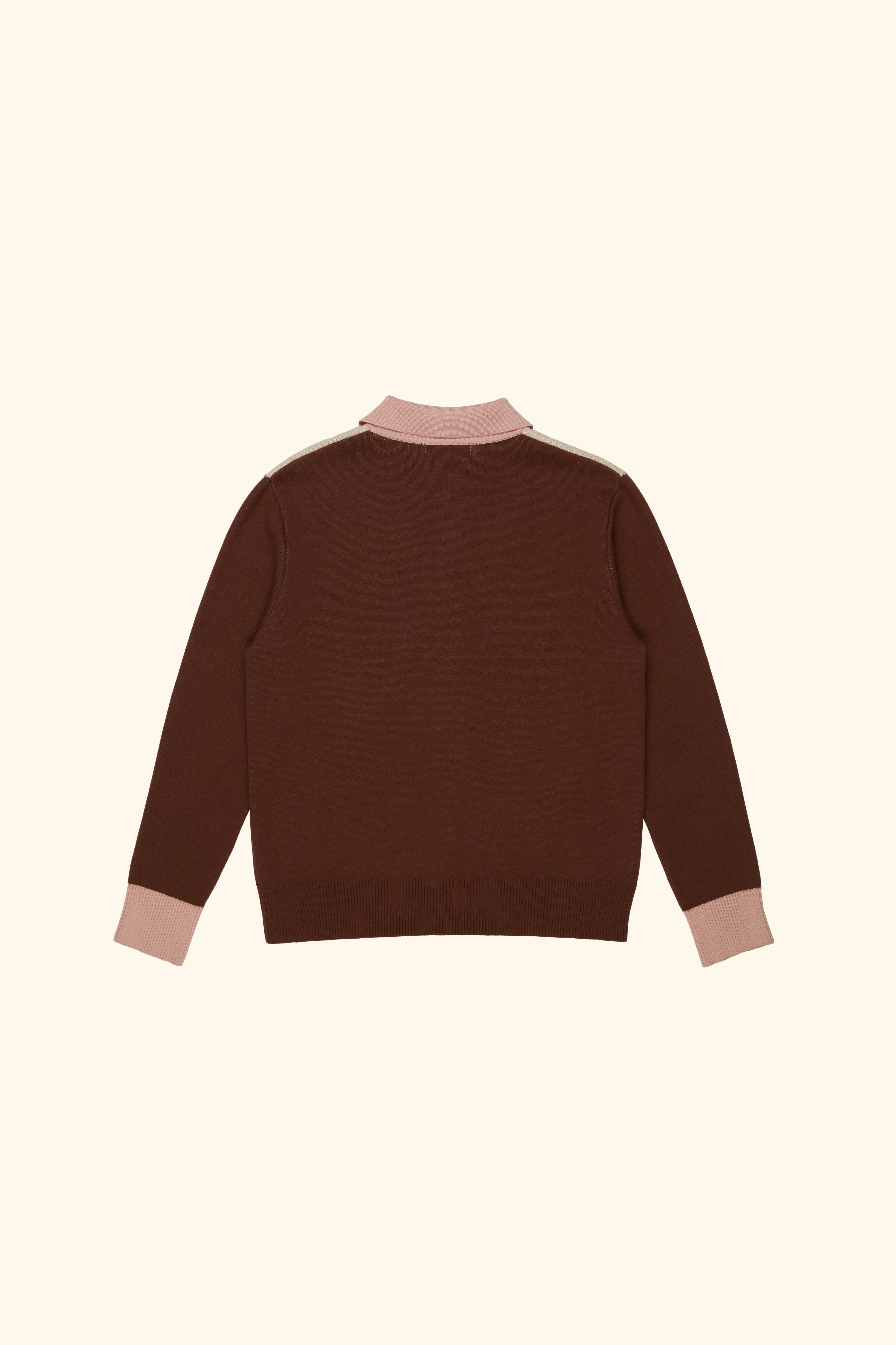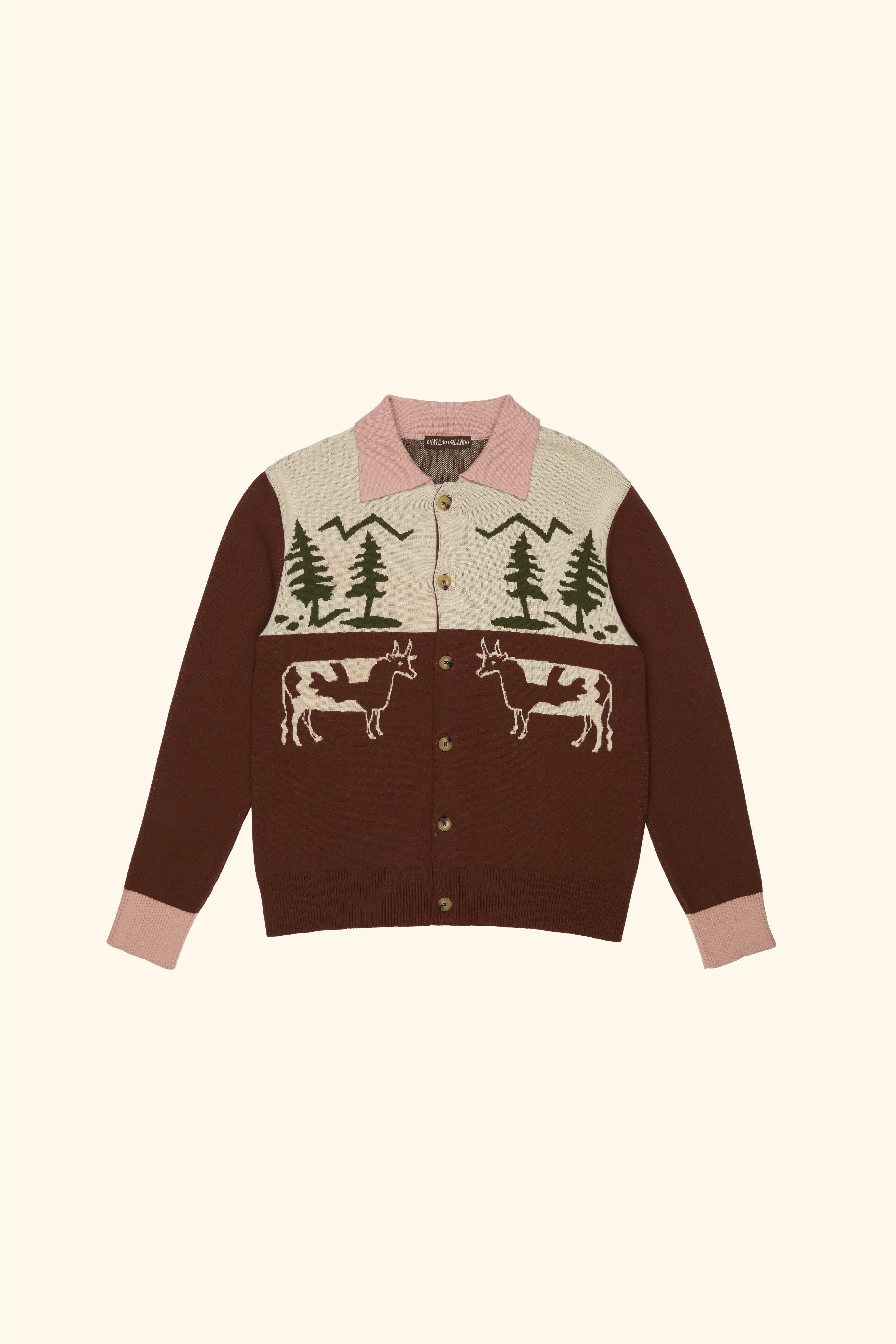 Cotton jacquard polo cardigan with design inspired by vintage souvenir sweaters and alpine scenery