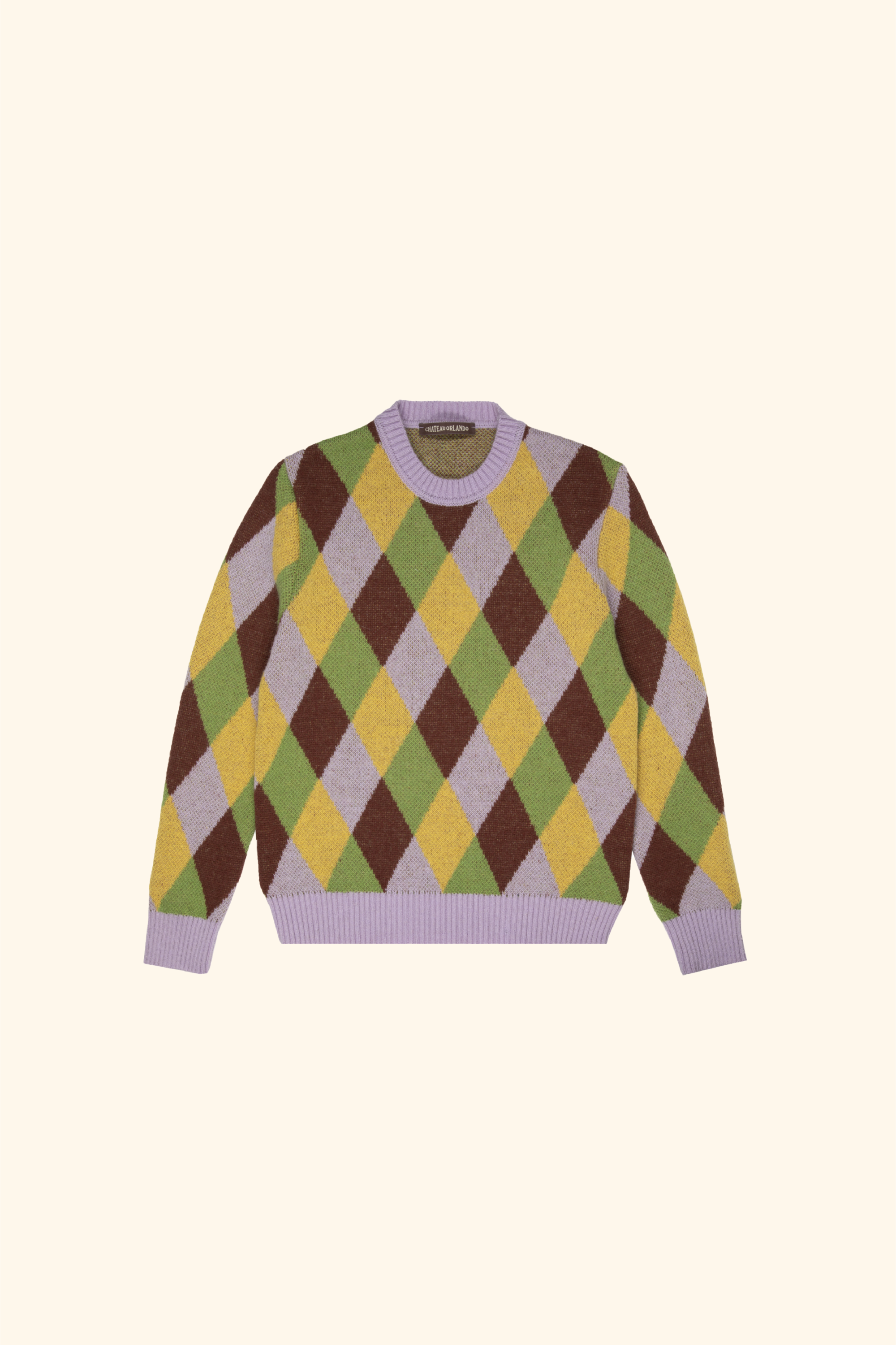 Mohair wool jacquard crewneck jumper with design inspired by traditional English folk dance costumes
