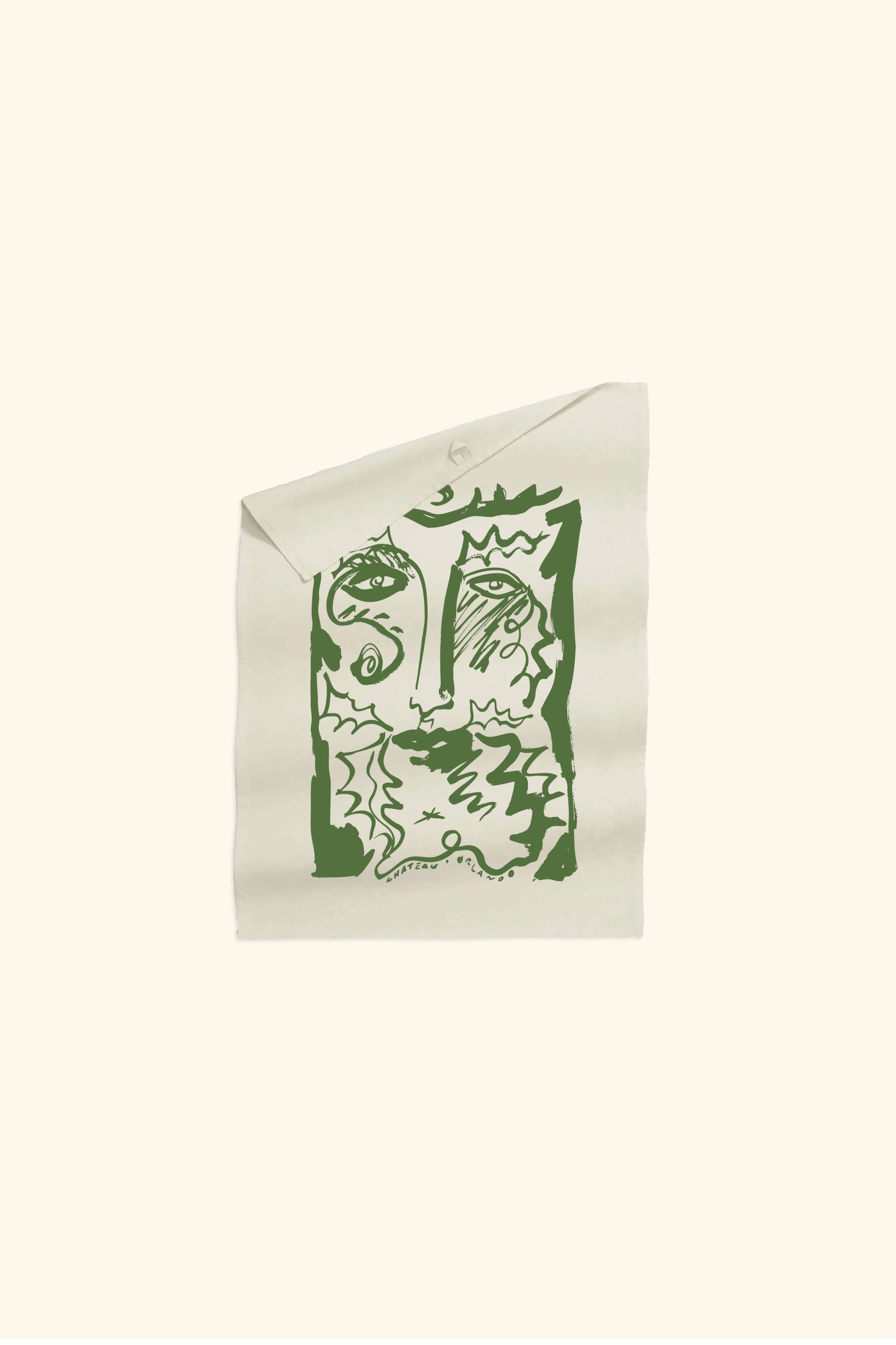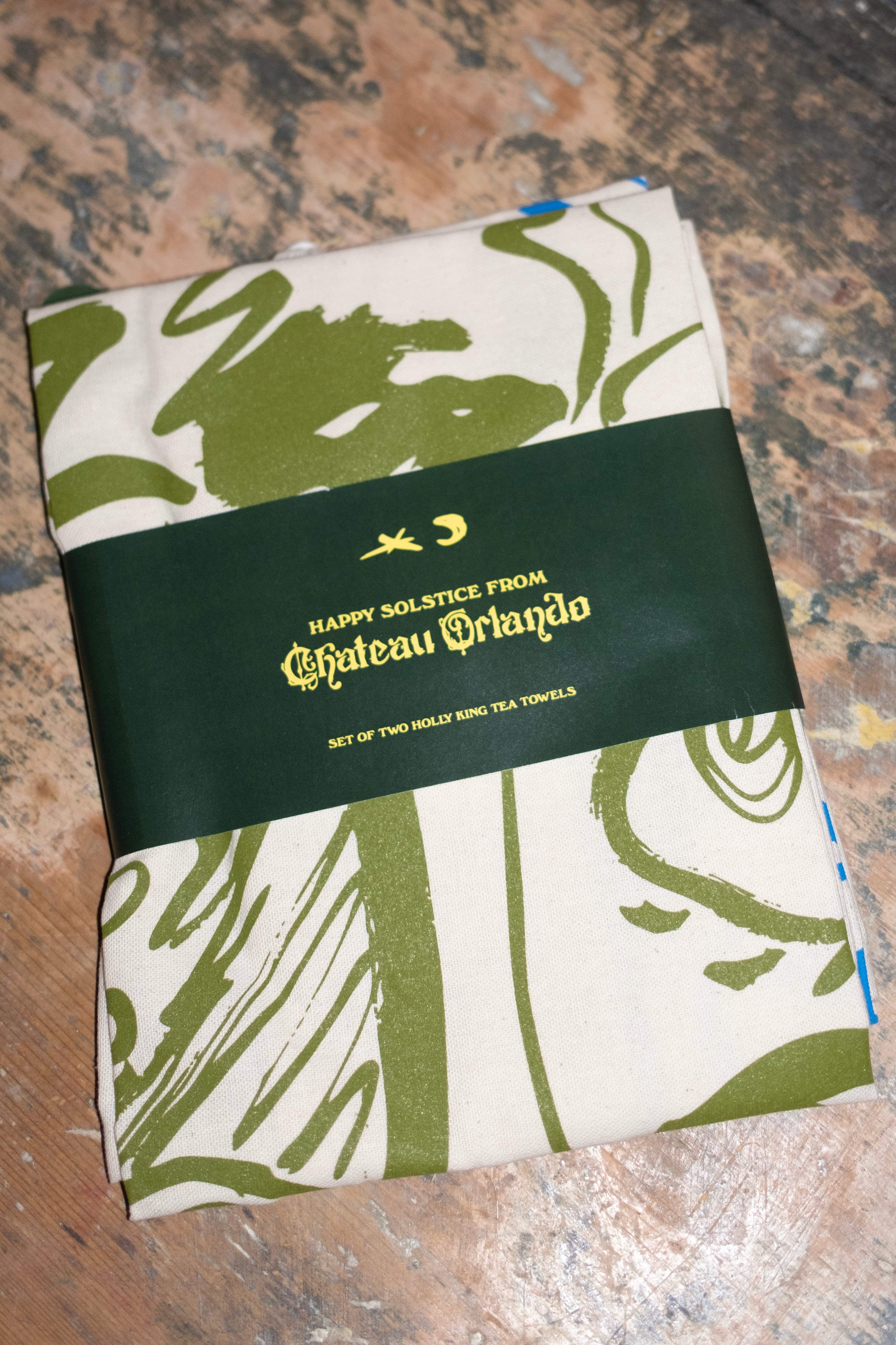 Set of two screenprinted cotton tea towels with design insipred by the Holly King, a folkloric figure and personification of winter